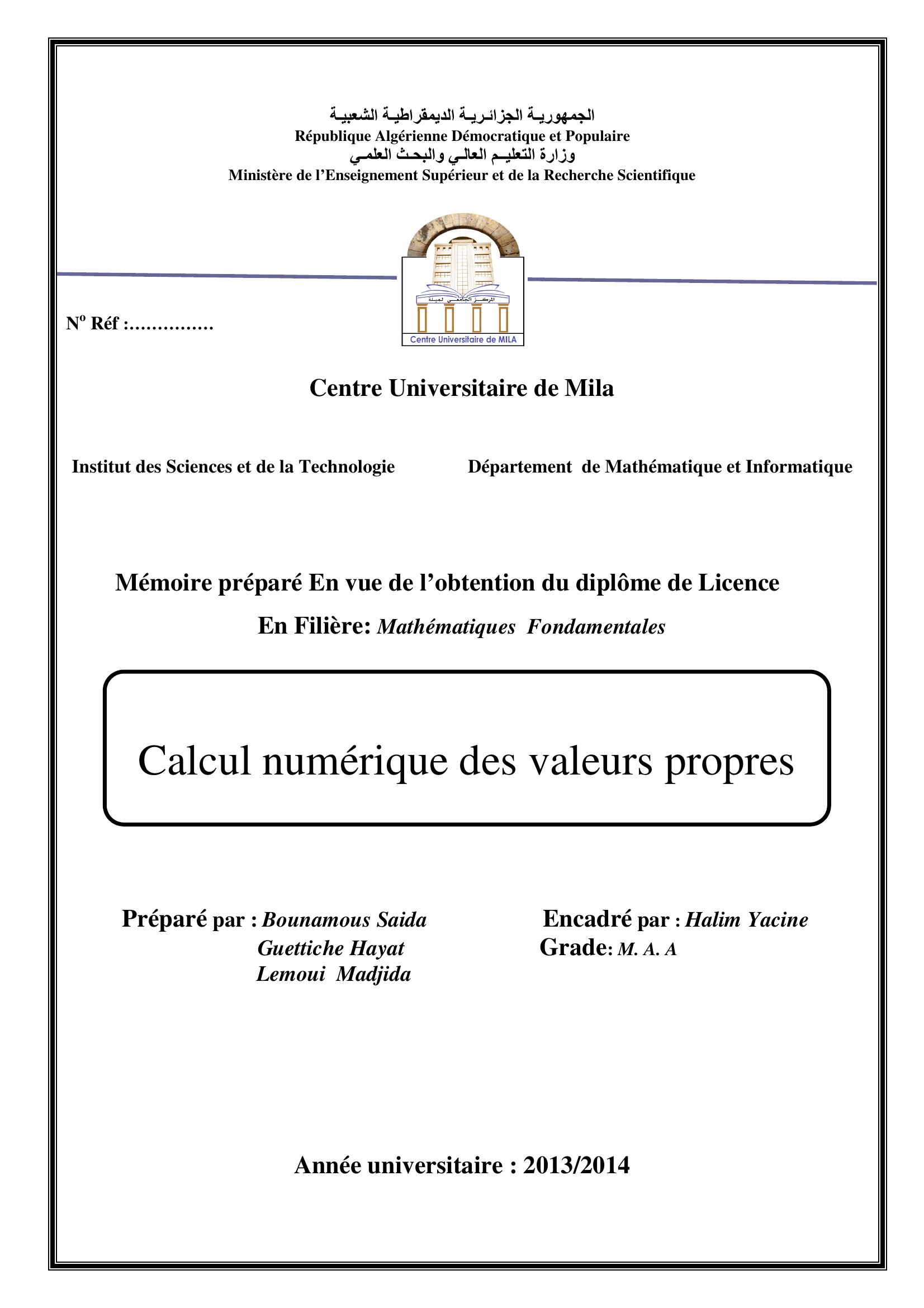 bonamous saida & Halim Yacine encadreur (2014). Calcul numérique des valeurs propres.