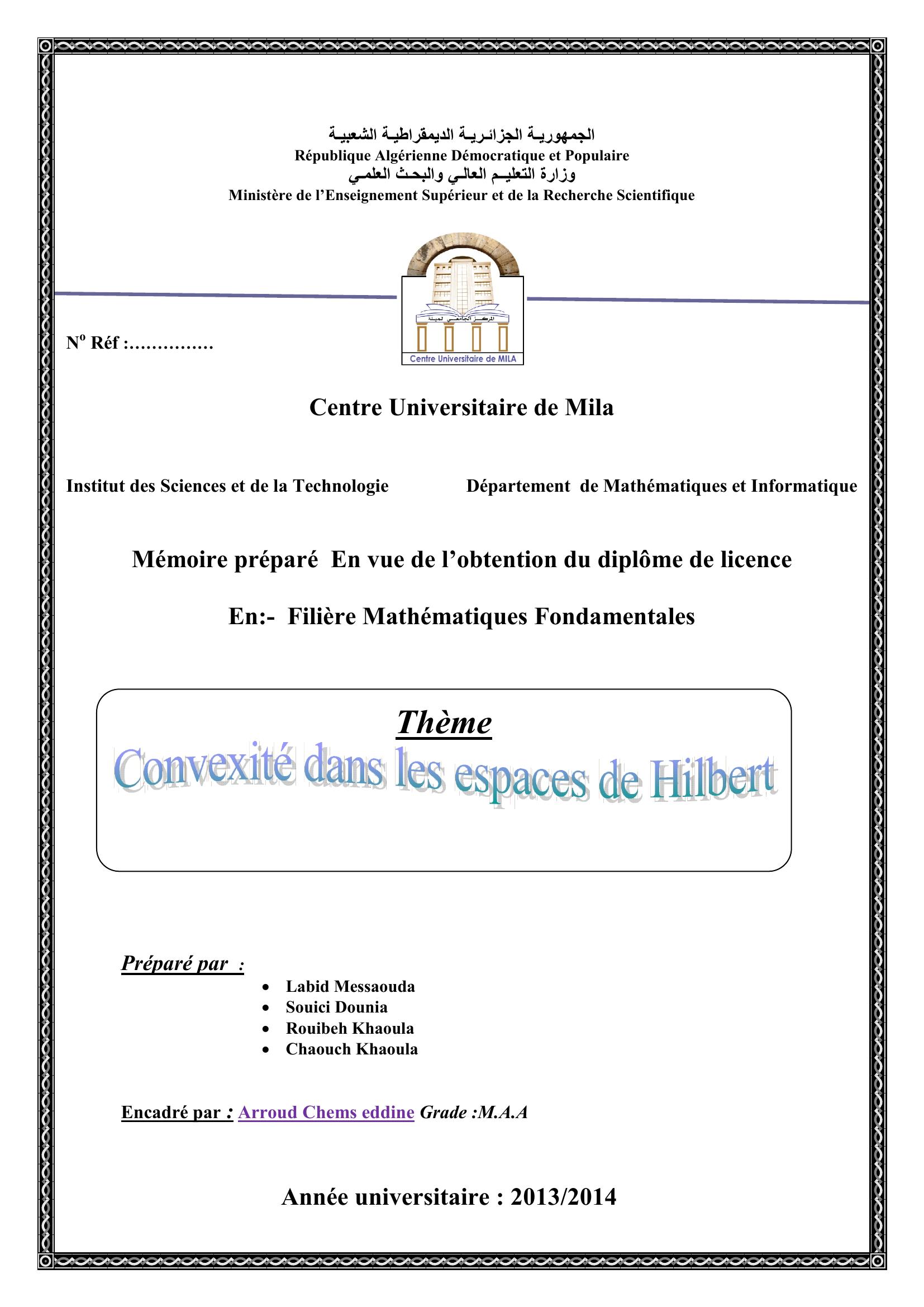 LABID messaouda & Arroud Chems eddine encadreur (2014). Convexité dans les espaces de hilbert.