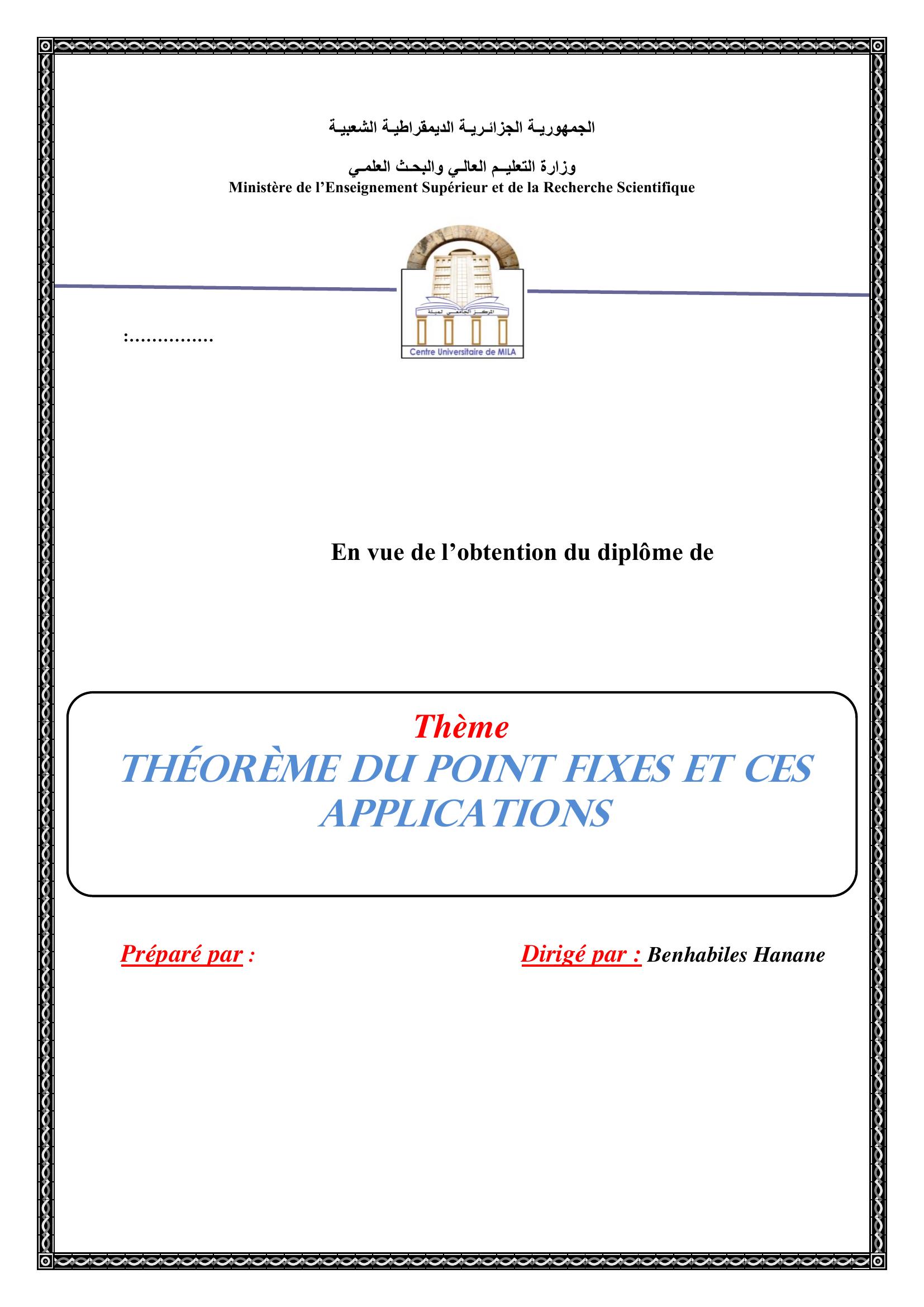 Bensassi Wissam & Benhabiles Hanane( encadreur) (2014). Théorème du point fixes et ces applications.