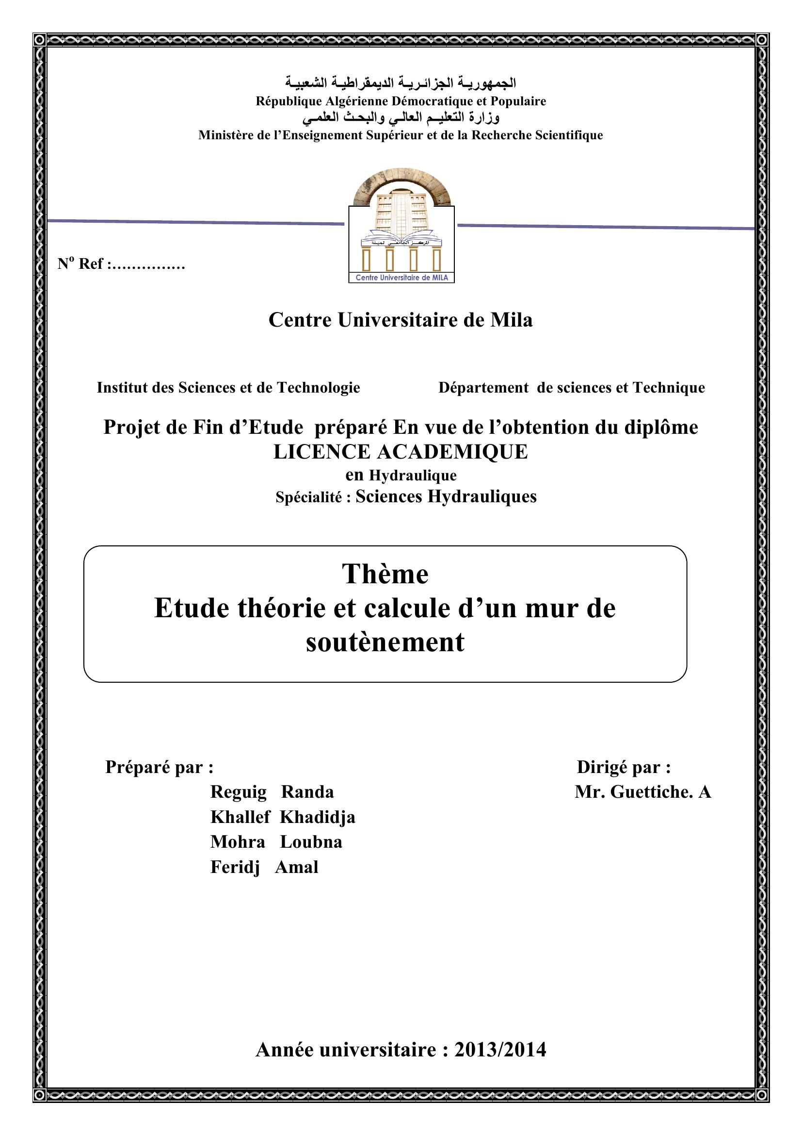 Reguig Randa & Guettiche. A encadreur (2014). Etude théorie et calcule d'un mur de souténement.