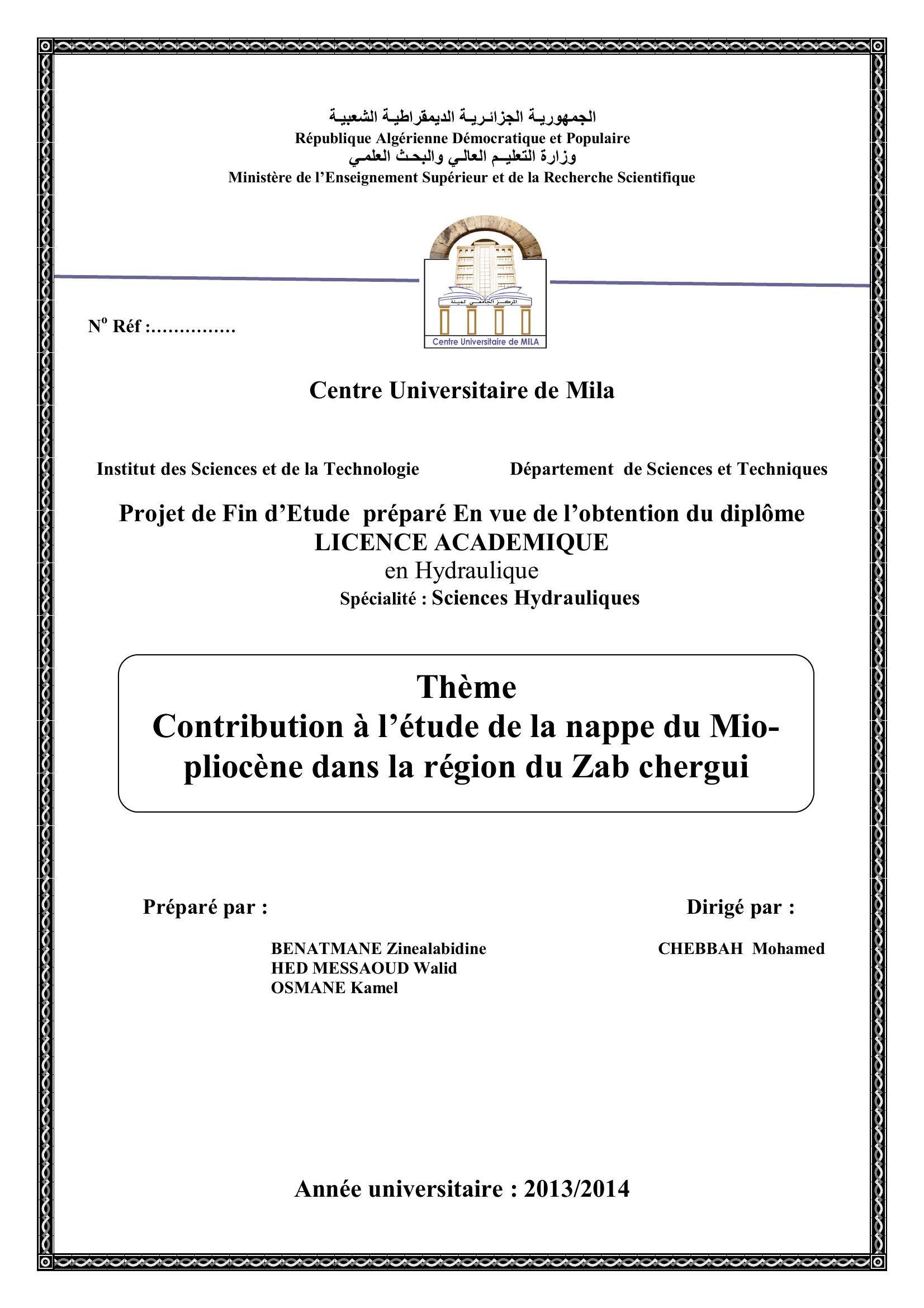 Benatmane Zinealabidine & CHEBBAH Mohamed encadreur (2014). Contribution à l'etude de la nappe du mio_pliocène dans la région du zab chergui.
