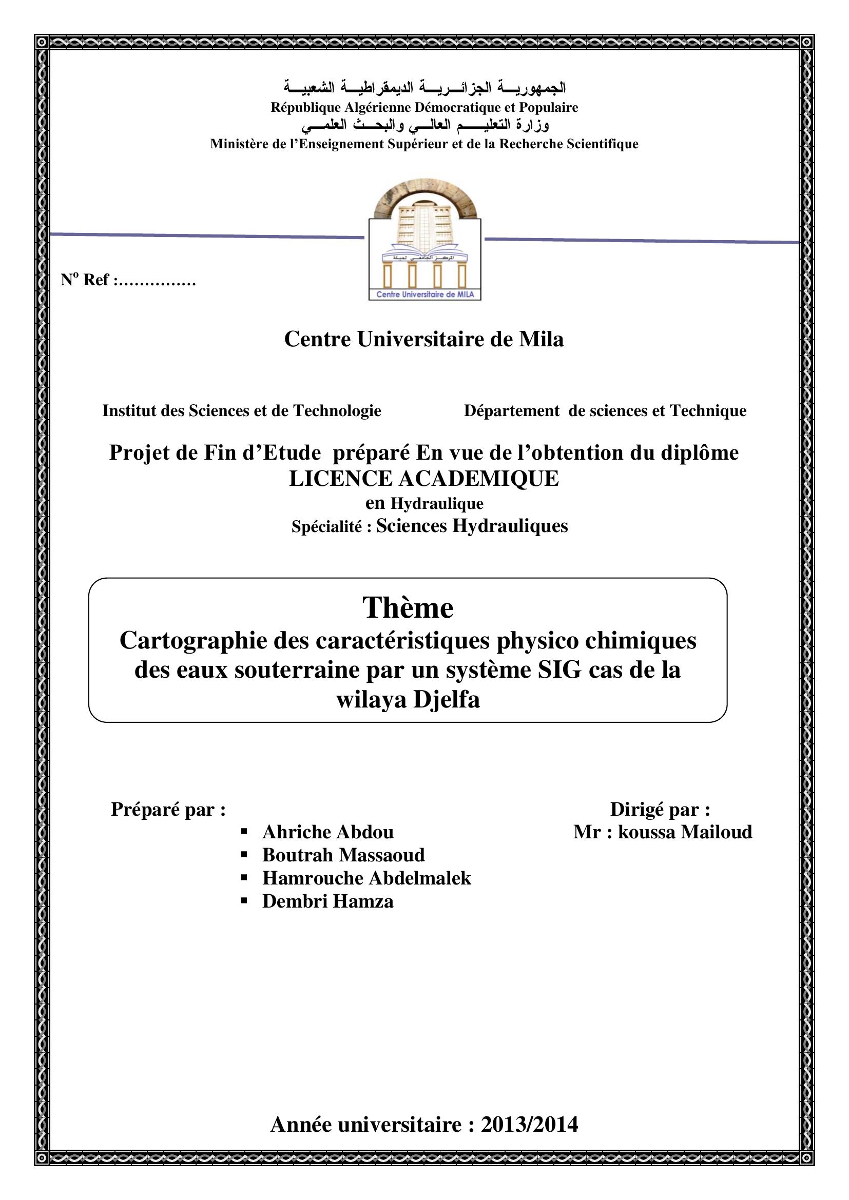 Ahriche Abdou & koussa Mailoud encadreur (2014). Cartographie des caractéristiques physico chimiques des eaux souterraine par un système SIG cas de la wilaya Djelfa.