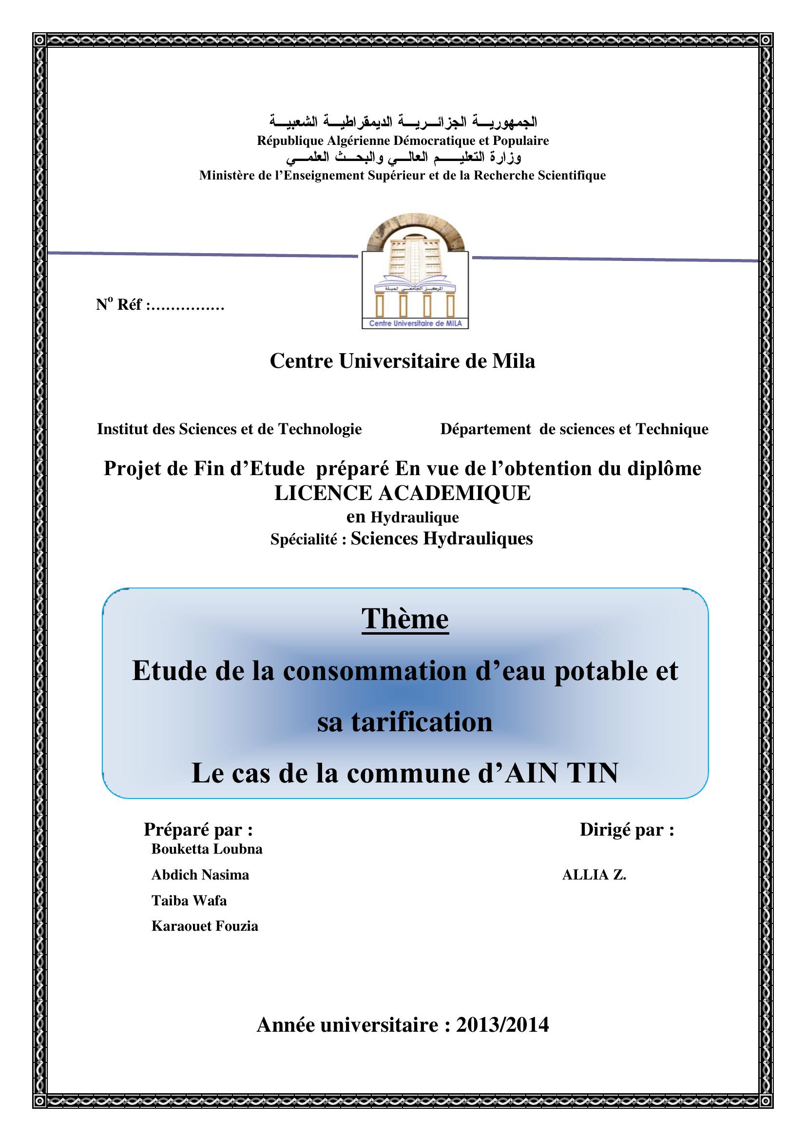 Bouketta Loubna & ALLIA. Z encadreur (2014). Etude de consommation d'eau potable et sa tarification le cas de commune d' Ain tin.