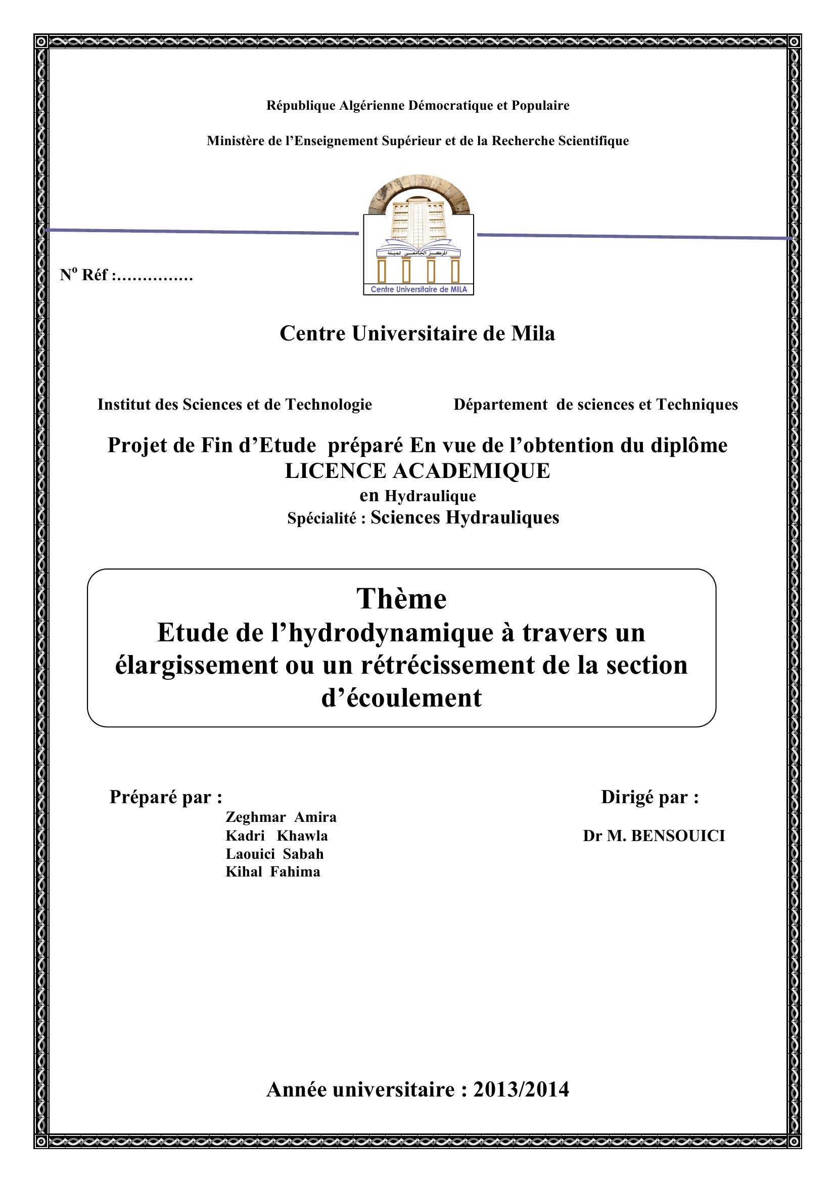 ZEGHMAR amira & M. Bensouici encadreur (2014). Etude de l'hydrodynamique à travers un élargissement ou un rétrécissement de la section d'écoulement.