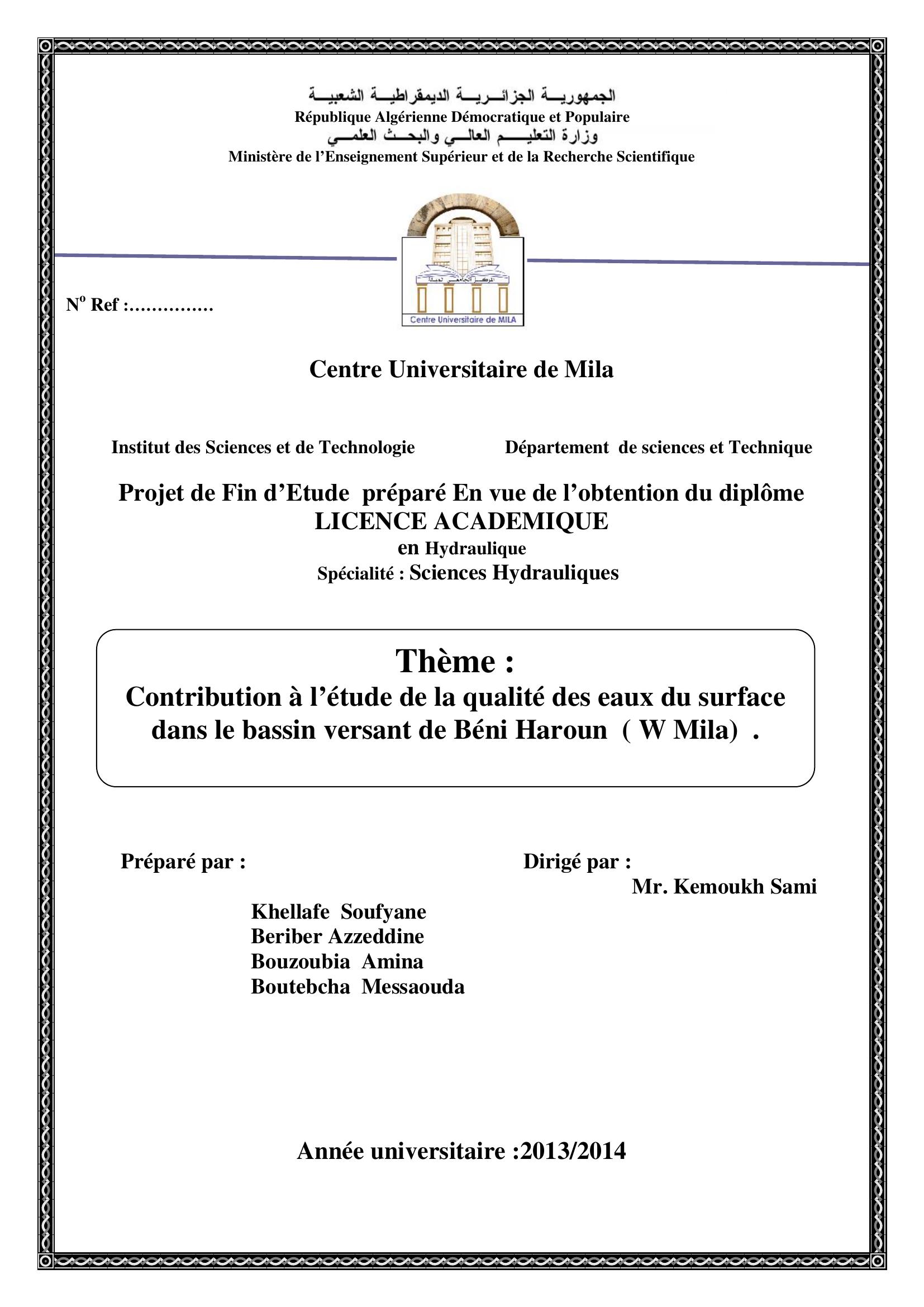 KHELLAF soufyane & Kemoukh Sami encadreur (2014). Contribution à l'etude de la qualité des eaux du surface dans la bassin versant de beni haroun - w. mila-.
