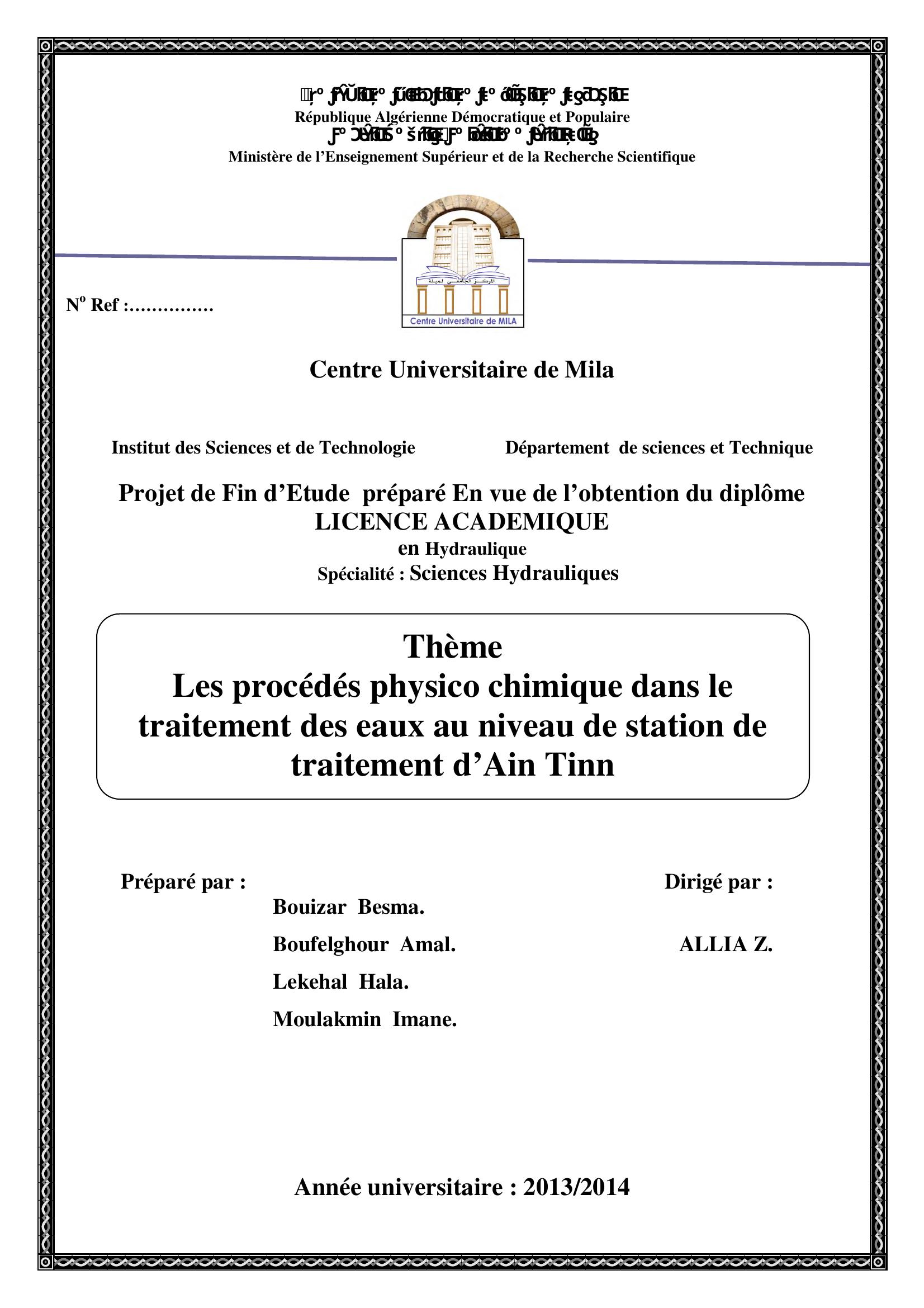 bouizar besma & ALLIA Z. encadreur (2014). Les procédés physico chimiques dans le traitement des eaux au niveau de station de traitement d'ain tinn.