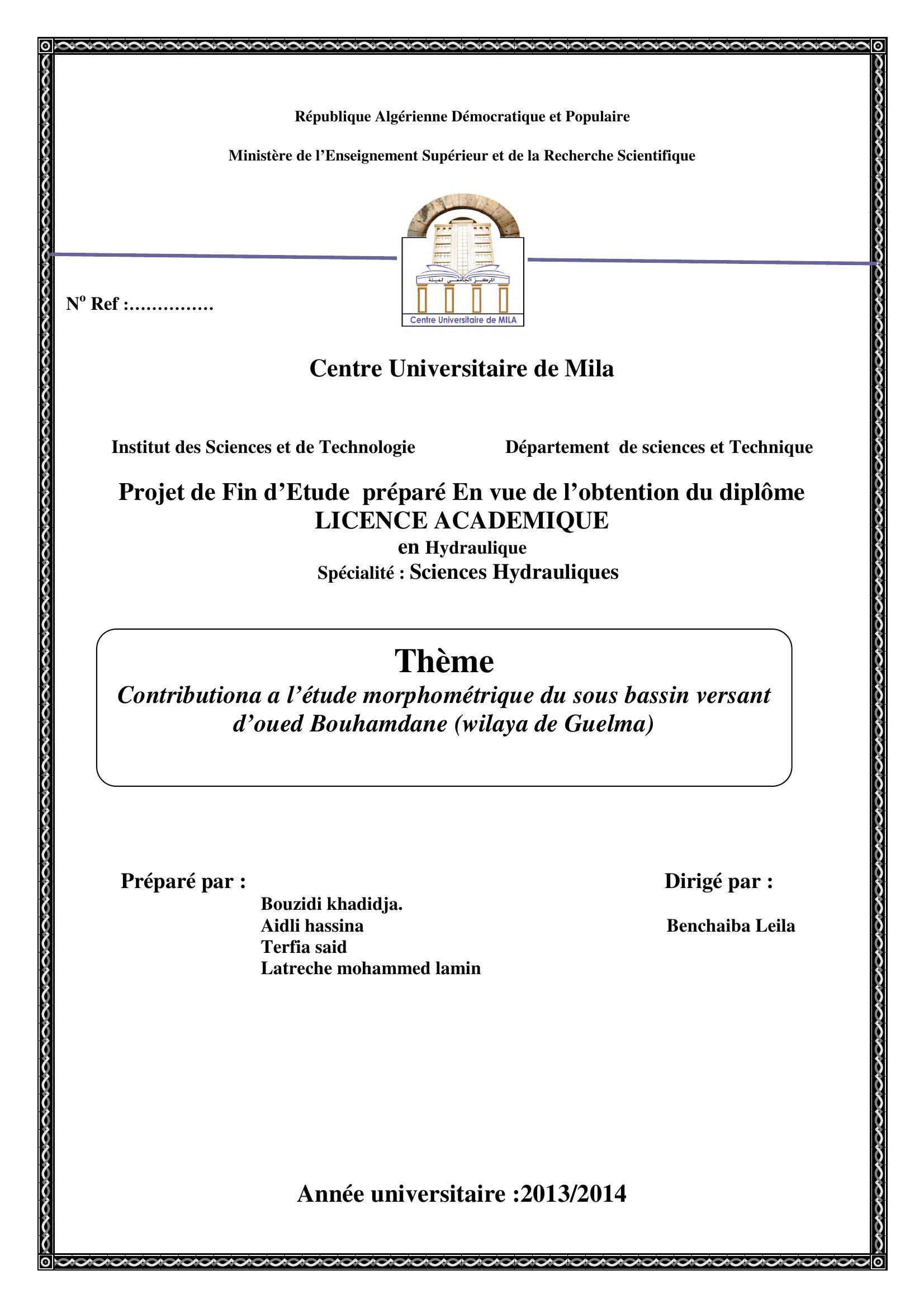 Bouzidi Khadidja & benchaiba leila encadreur (2014). Contribution a l'étude morphpmétrique du sous bassin versant d'oued Bouhamdane wilaya de guelma.