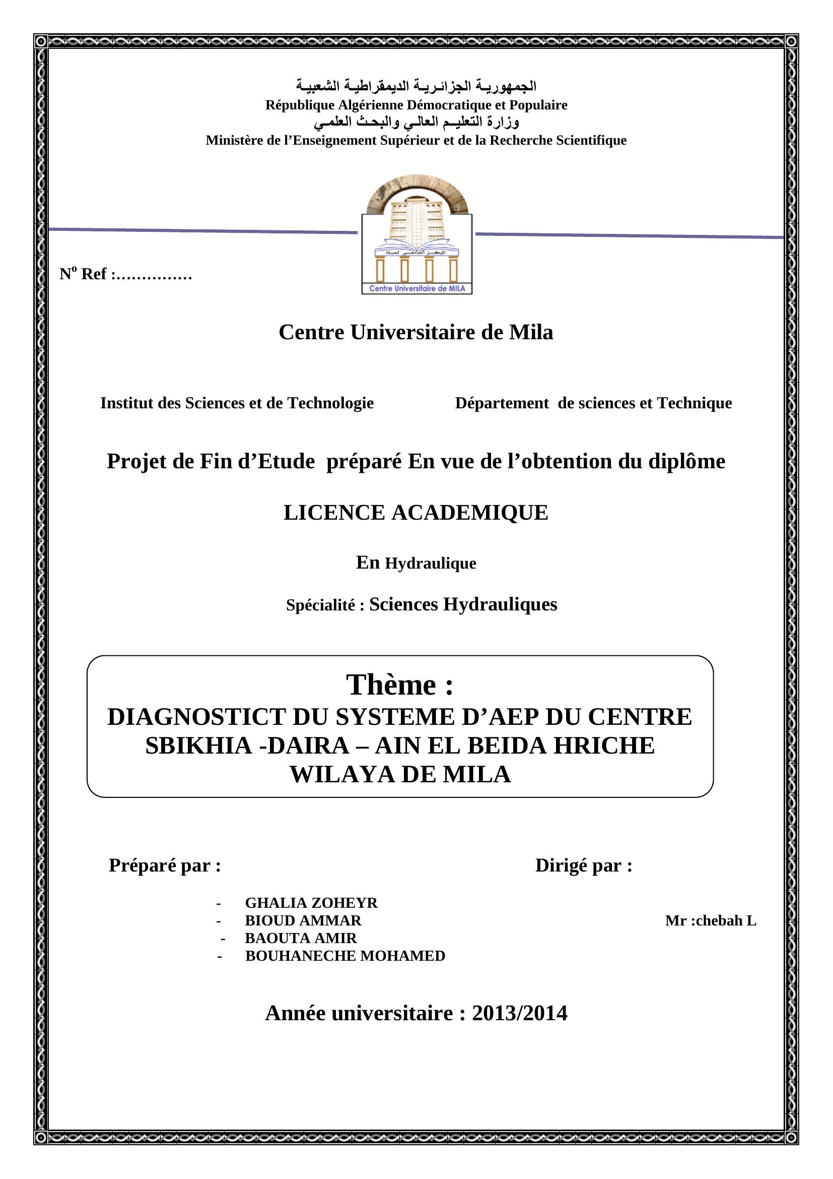 BIOUD ammar & chebah L encadreur (2014). Diagnostict du système d'aep du centre sbikhia - daira - ain elbeida hriche w. de mila.