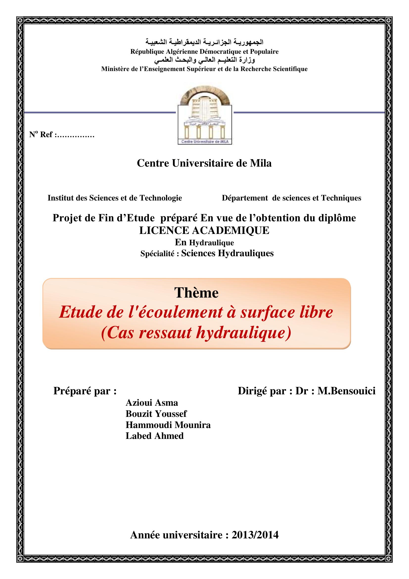 Azioui asma & M.Bensouici encadreur (2014). Etude de l'ecoulement à surface libre (cas ressaut hydraulique).