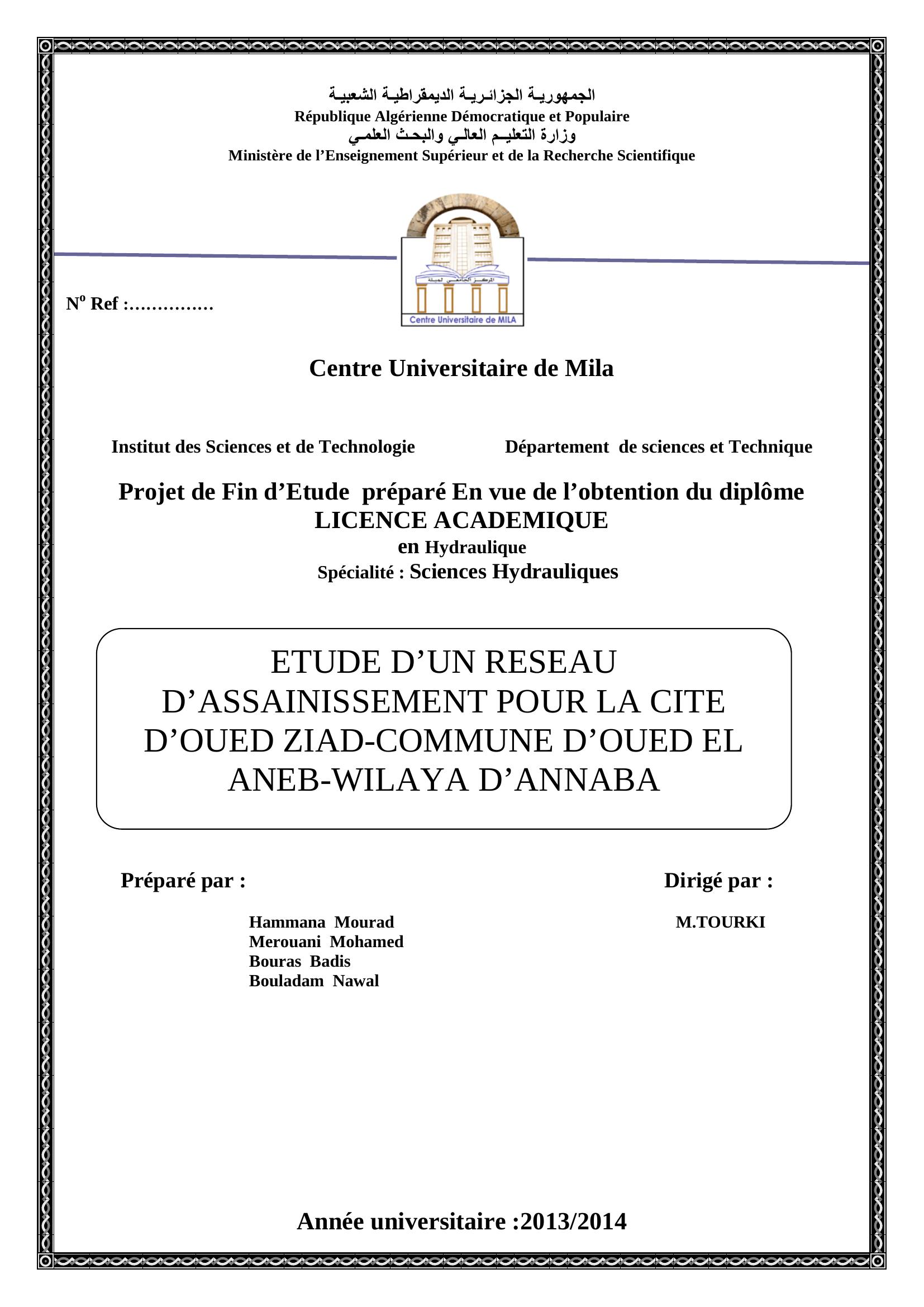 Hammana Mourad & M.TOURKI encadreur (2014). Etude d'un reseau d'assainissement pour la cite d'oued ziad-commune d'oued el aneb-wilaya d'annaba.