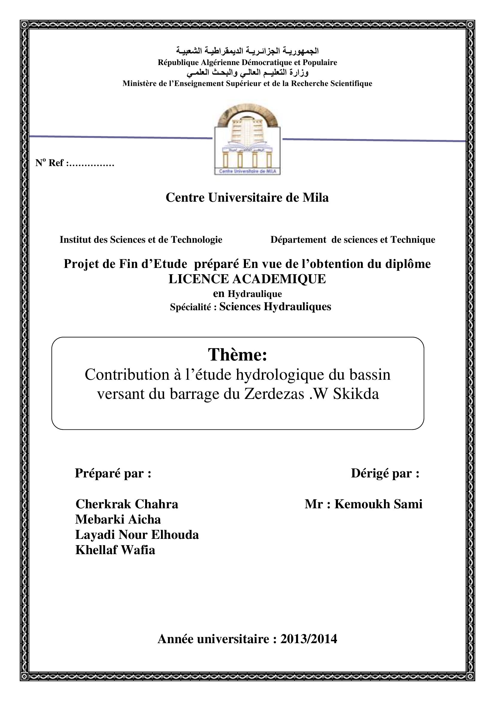 Cherkrak Chahra & Kemoukh Sami encadreur (2014). Contribution à létude hydrologique du bassin versant du barrage du Zerdezas.W Skikda.