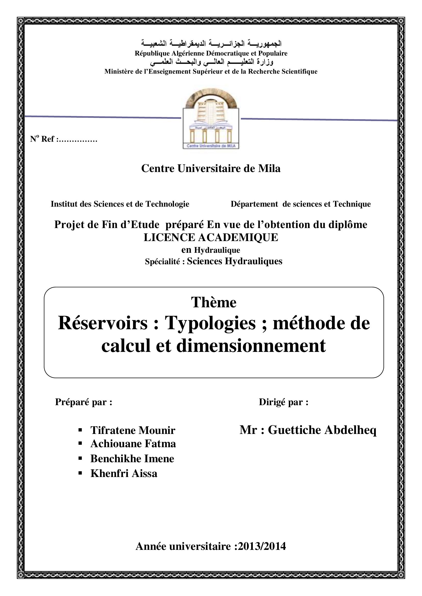 Tifratene Mounir & Guettiche Abdelheq encadreur (2014). Réservoirs :typologies;méthode de calcule et dimensionnement.