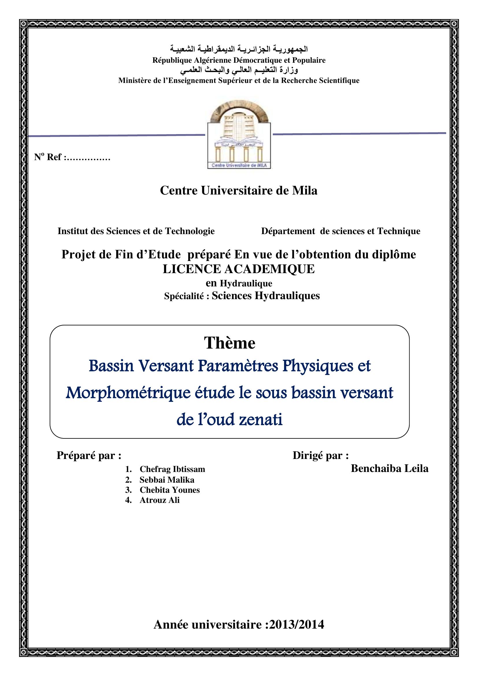SEBBAI malika & benchaiba leila encadreur (2014). Bassin versant paramètres physiques et morphom"trique étude le sous bassin versant de l'oud zenati.