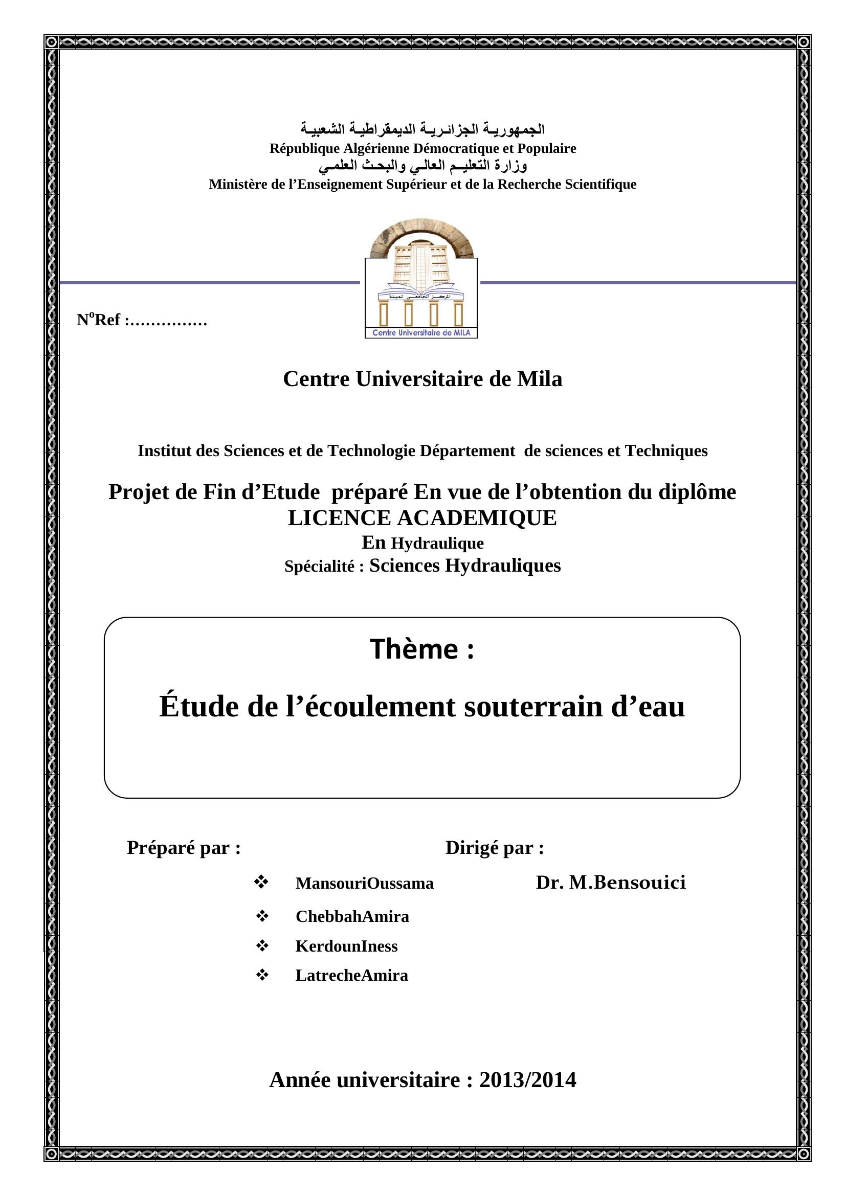 MANSOURI oussama & M.Bensouici encadreur (2014). Etude de l'écoulement souterrain d'eau.