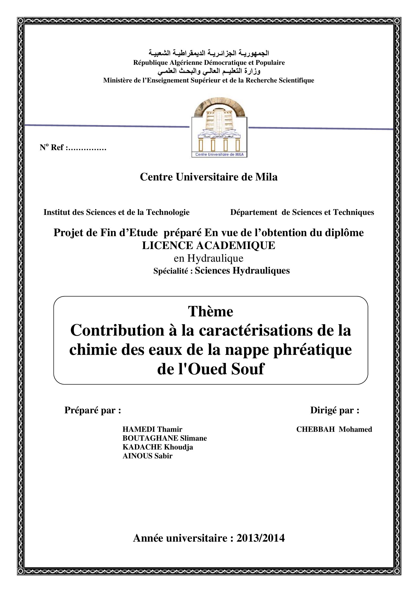 BOUTAGHANE slimane & CHebbah Mohamed (encadreur) (2014). Contribution à la la caractéris&tions de la chemie des eaux de la nappe phréatique de l'oued souf.