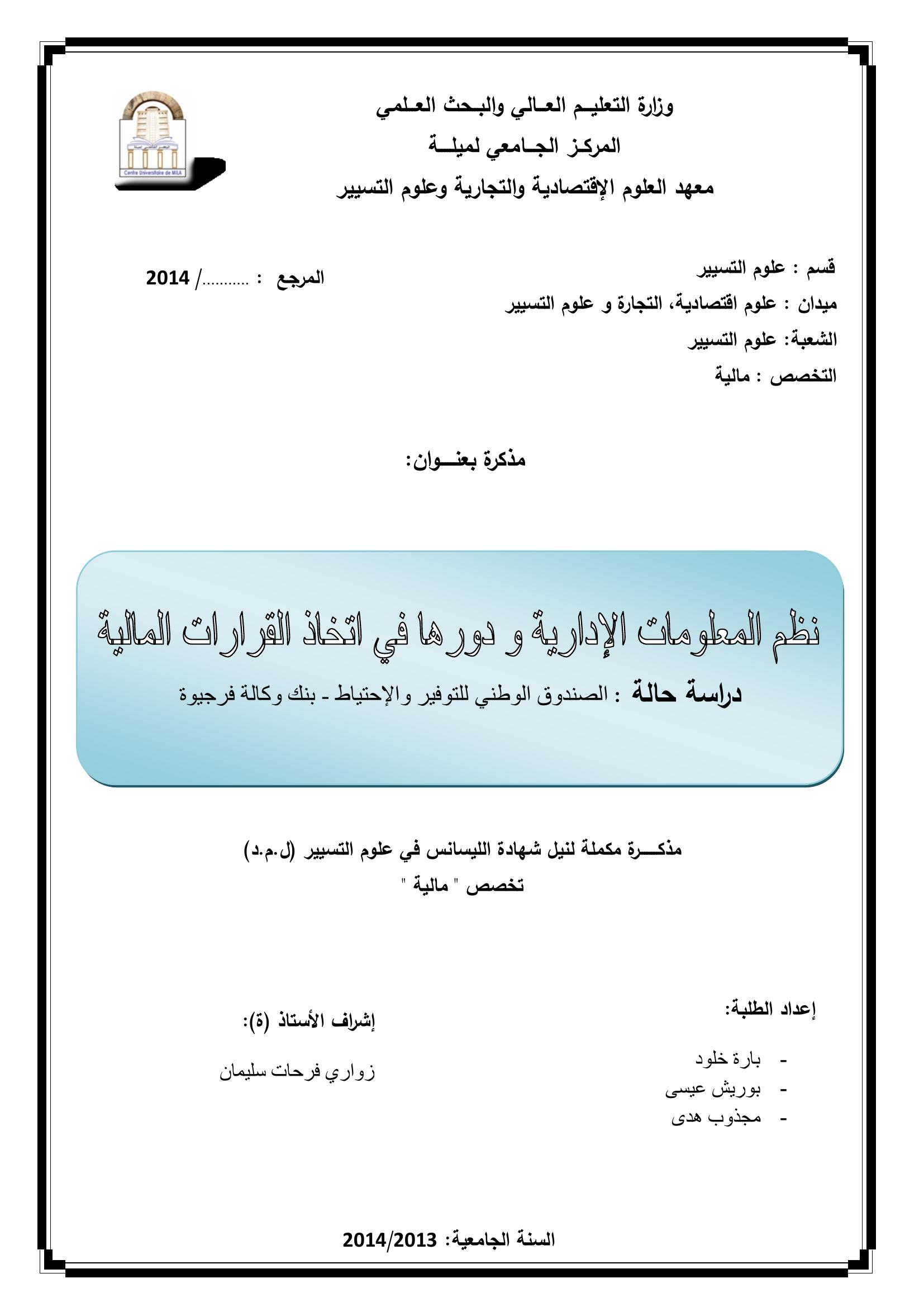 بارة خلود & زواري فرحات سليمان(مشرفا) (2014). نظم المعلومات الإدارية ودورها في إتخاد القرارات المالية دراسة حالة الصندوق الوطني للتوفير و الإحتياط - بنك وكالة فرجيوة -.