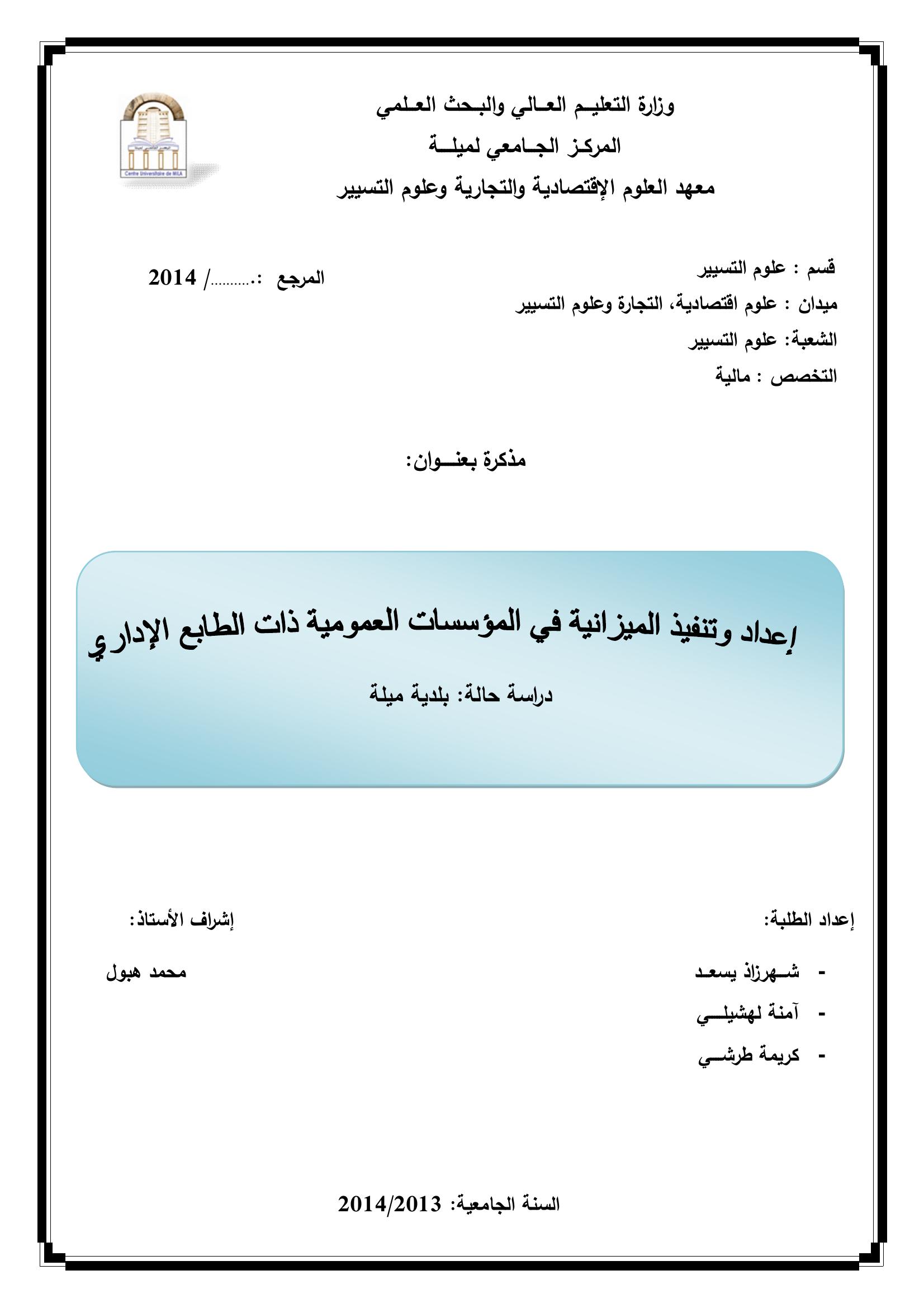 يسعد شهرزاد & هبول محمد(مشرفا) (2014). اعداد وتنفيد الميزانية في المؤسسات العمومية ذات الطابع الاداري دراسة حالة بلدية ميلة.