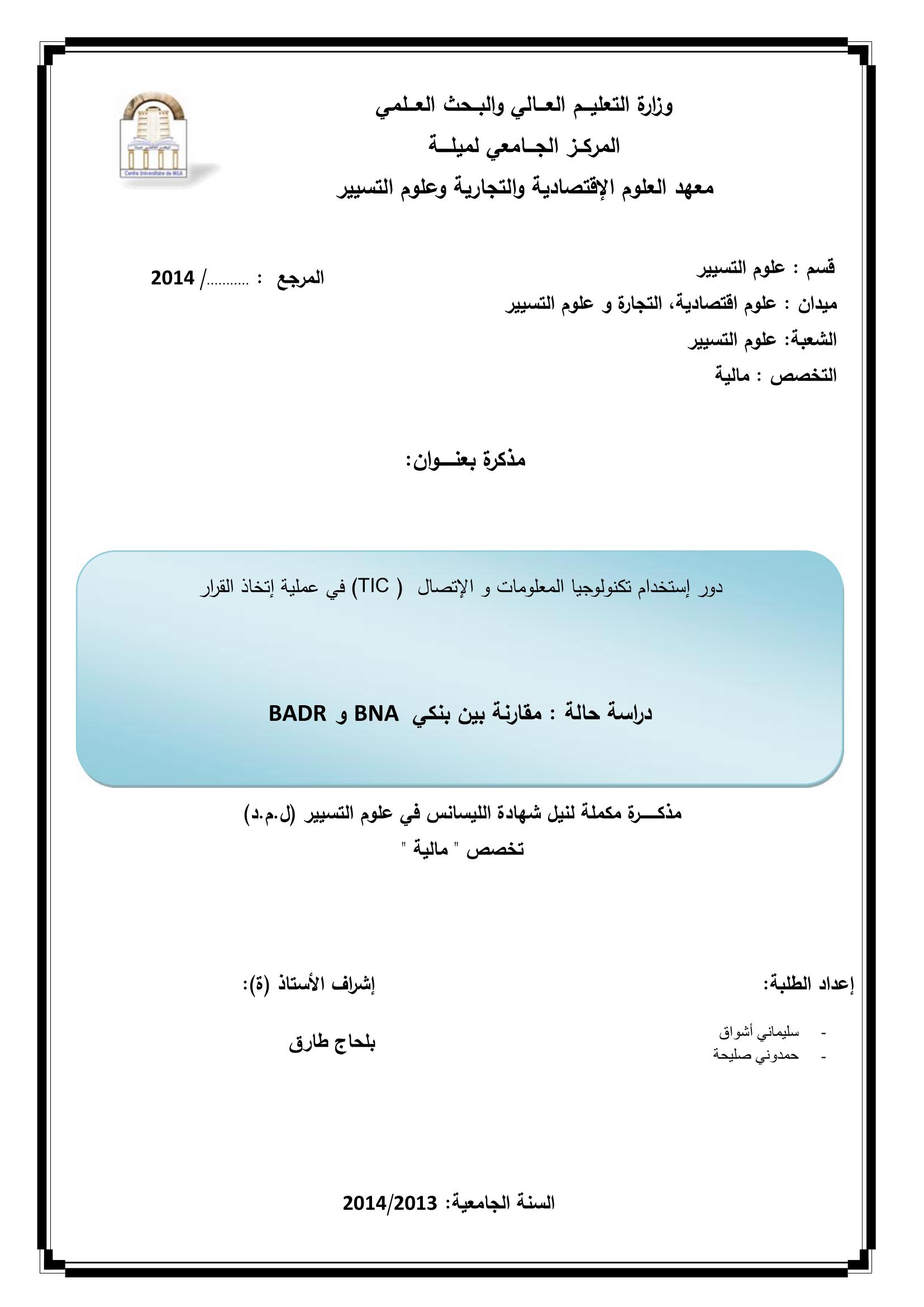 دور إستخدام تكنولوجيا المعلومات والإتصال(TIC) في عملية إتخاذ القرار دراسة حالة مقارنة بين بنكي BNA وBADR