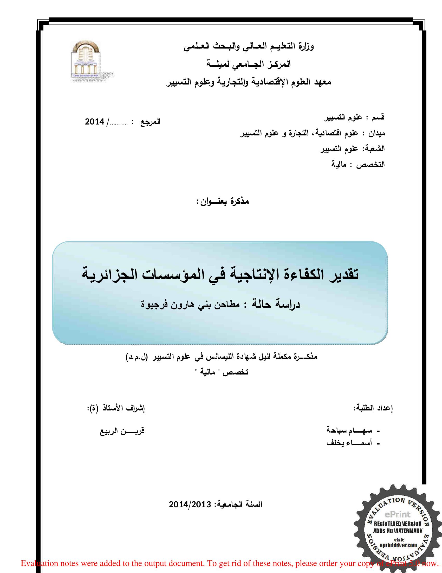 تقدير الكفاءة الإنتاجية في المؤسسات الجزائرية - دراسة حالة مطاحن بني هارون فرجيوة -
