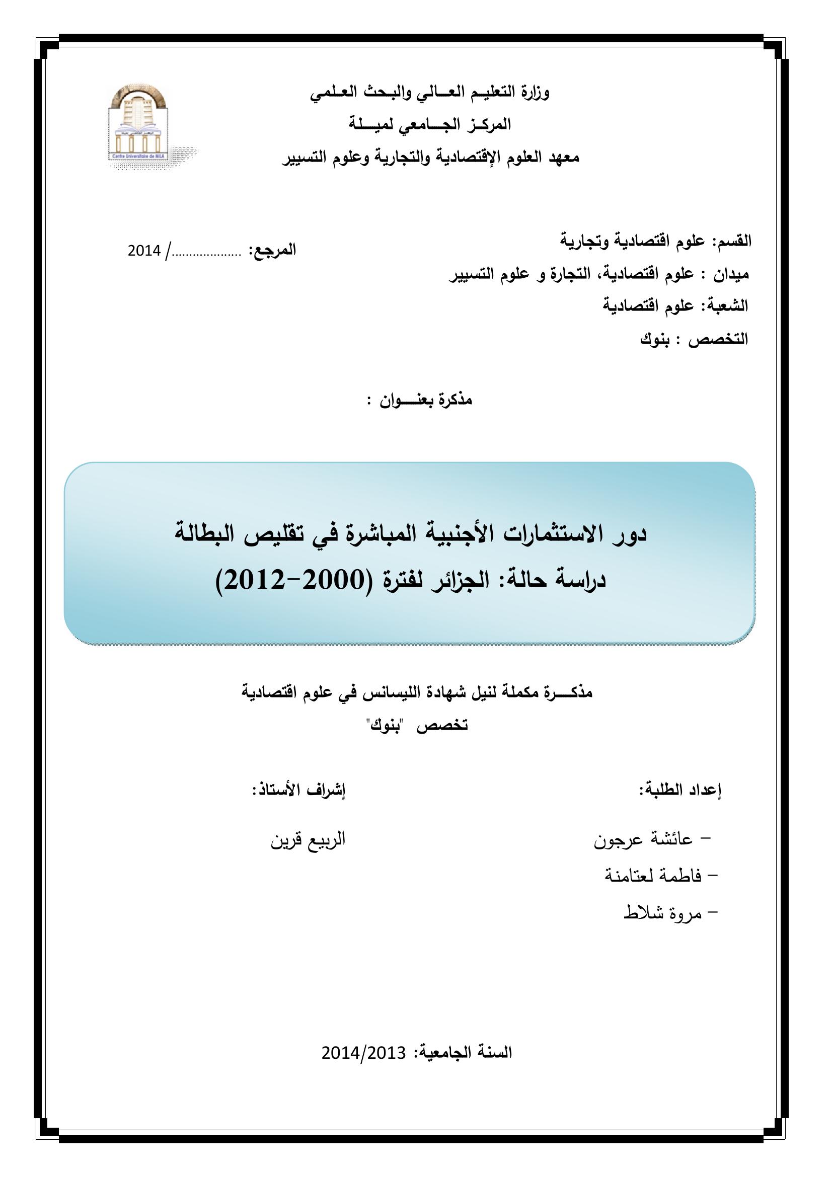 عرجون عائشة & الربيع قرين(مشرفا) (2014). دور الاستثمارات الأجنبية المباشرة في تقليص البطالة دراسة حالة الجزائر لفترة (2000-2012).