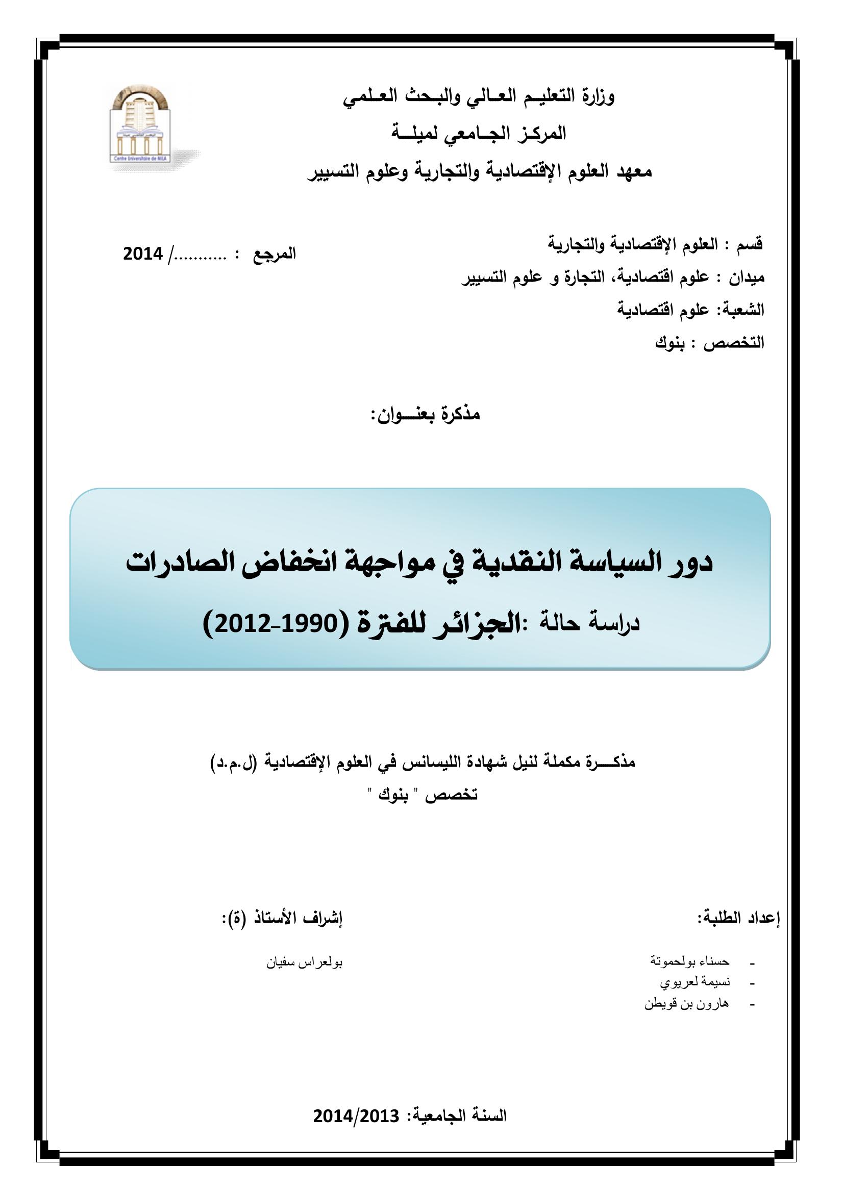 بولحموتة حسناء & بولعراس سفيان(مشرفا) (2014). دراسة السياسة النقدية في مواجهة انخفاض الصادرات دراسة حالة : الجزائر للفترة (1990-2012).