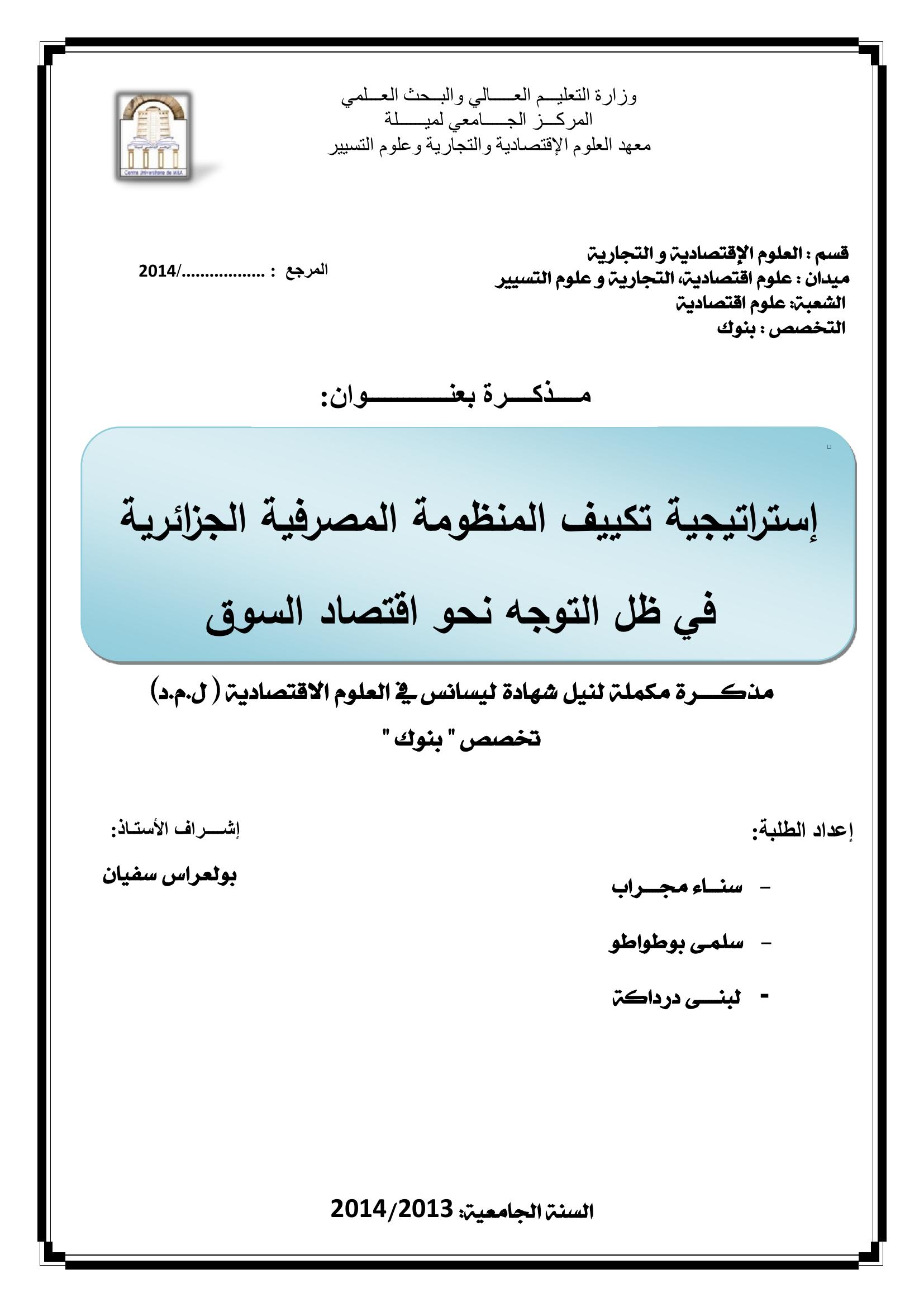 مجراب سناء & بولعراس سفيان(مشرفا) (2014). إستراتيجية تكييف المنظومة المصرفية الجزائرية في ظل التوجه نحوى اقتصاد السوق.