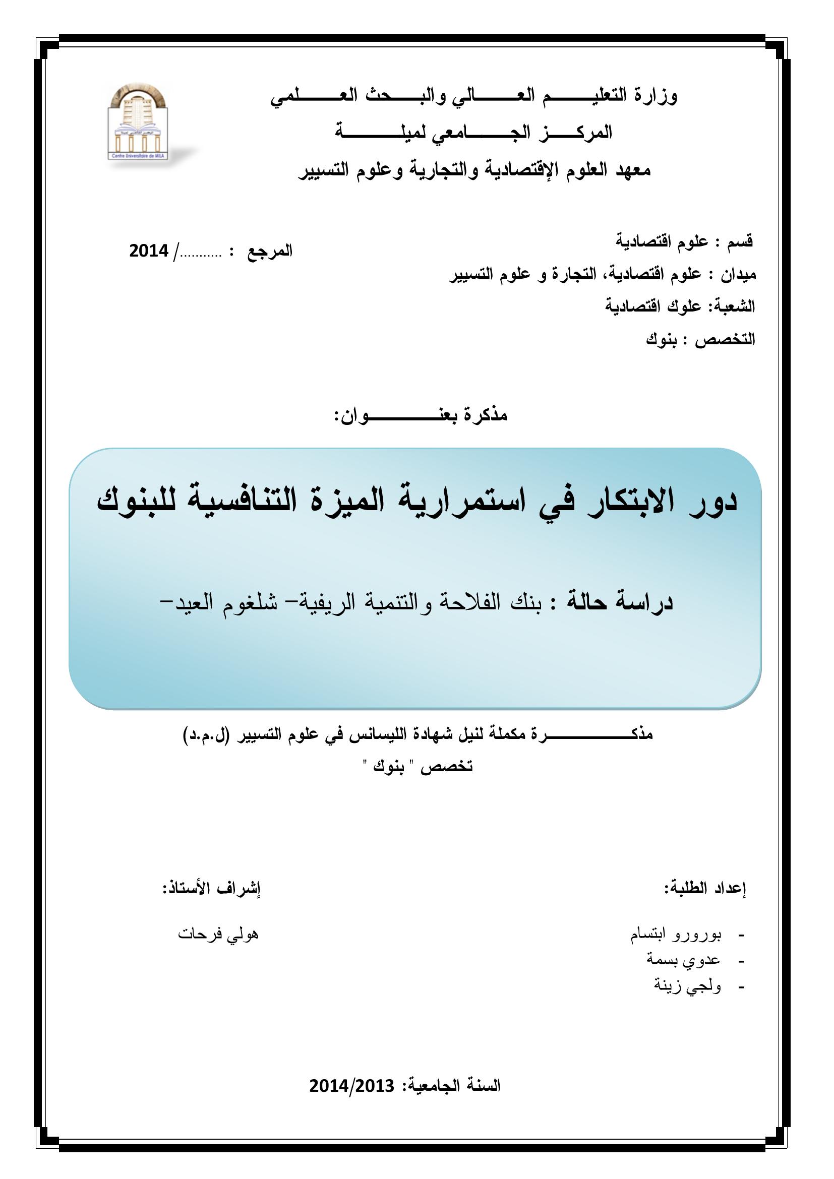 بورورو ابتسام & هولي فرحات (مشرفا) (2014). دور الابتكار في استمرارية الميزة التنافسية للبنوك دراسة حالة بنك الفلاحة والتنمية الريفية - شلغوم العيد -.