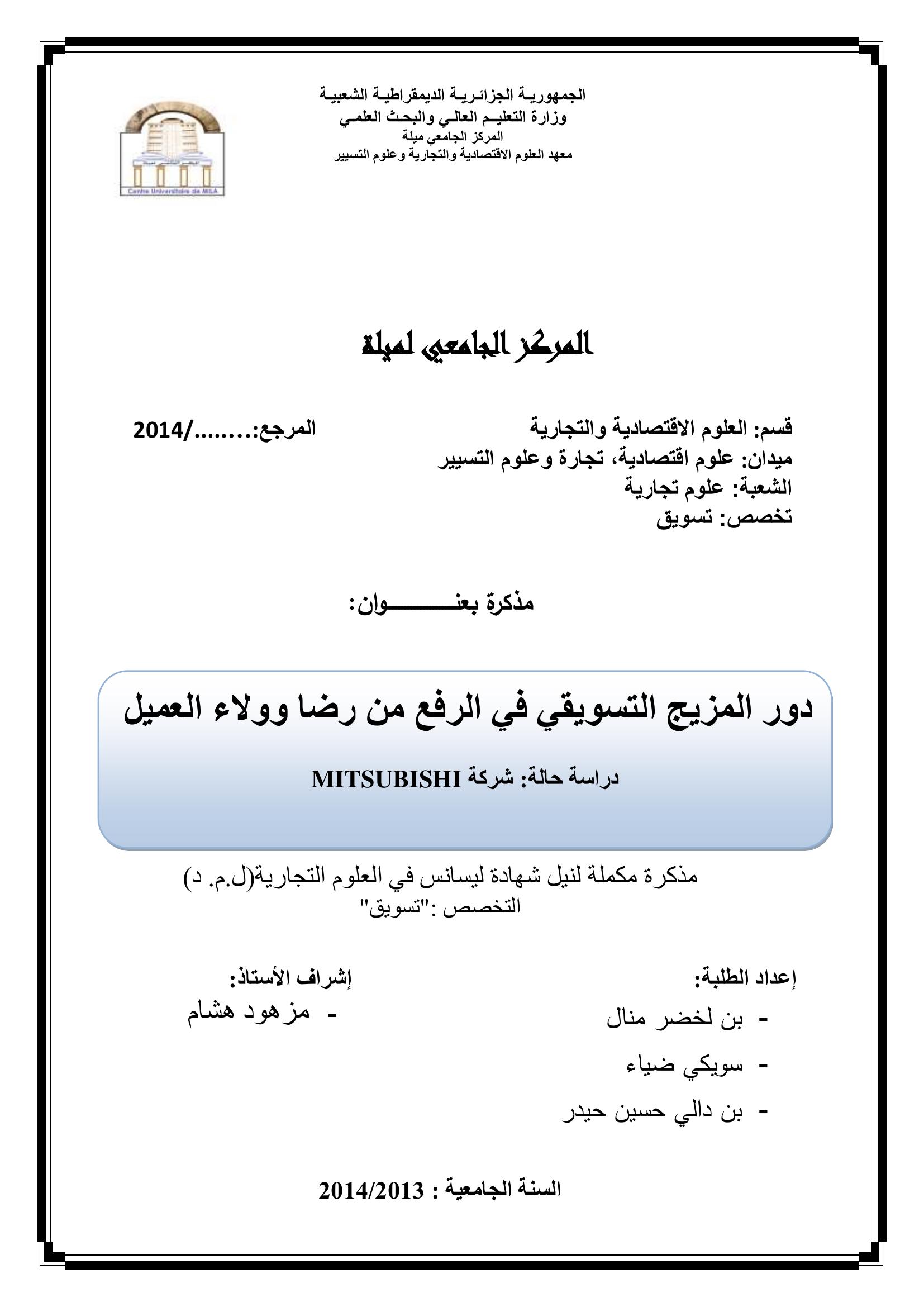 بن لخضر منال & مزهود هشام(مشرفا) (2014). دور المزيج التسويقي في الرفع من رضا وولاء العميل دراسة حالة شركة MITSUBISHI.