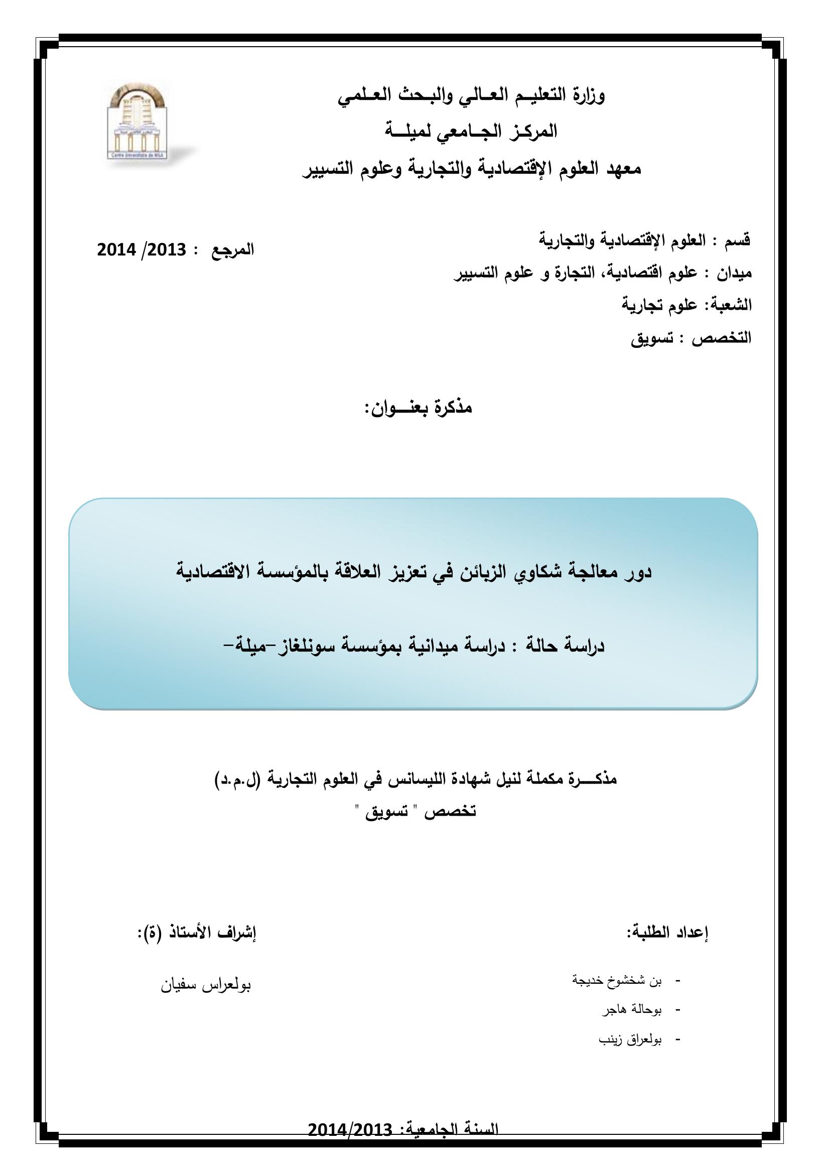 بن شخشوخ خديجة & بولعراس سفيان(مشرفا) (2014). دور معالجة شكاوي الزبائن في تعزيز العلاقة بالمؤسسة الإقتصادية دراسة حالة دراسة ميدانية بمؤسسة سونلغاز -ميلة -.
