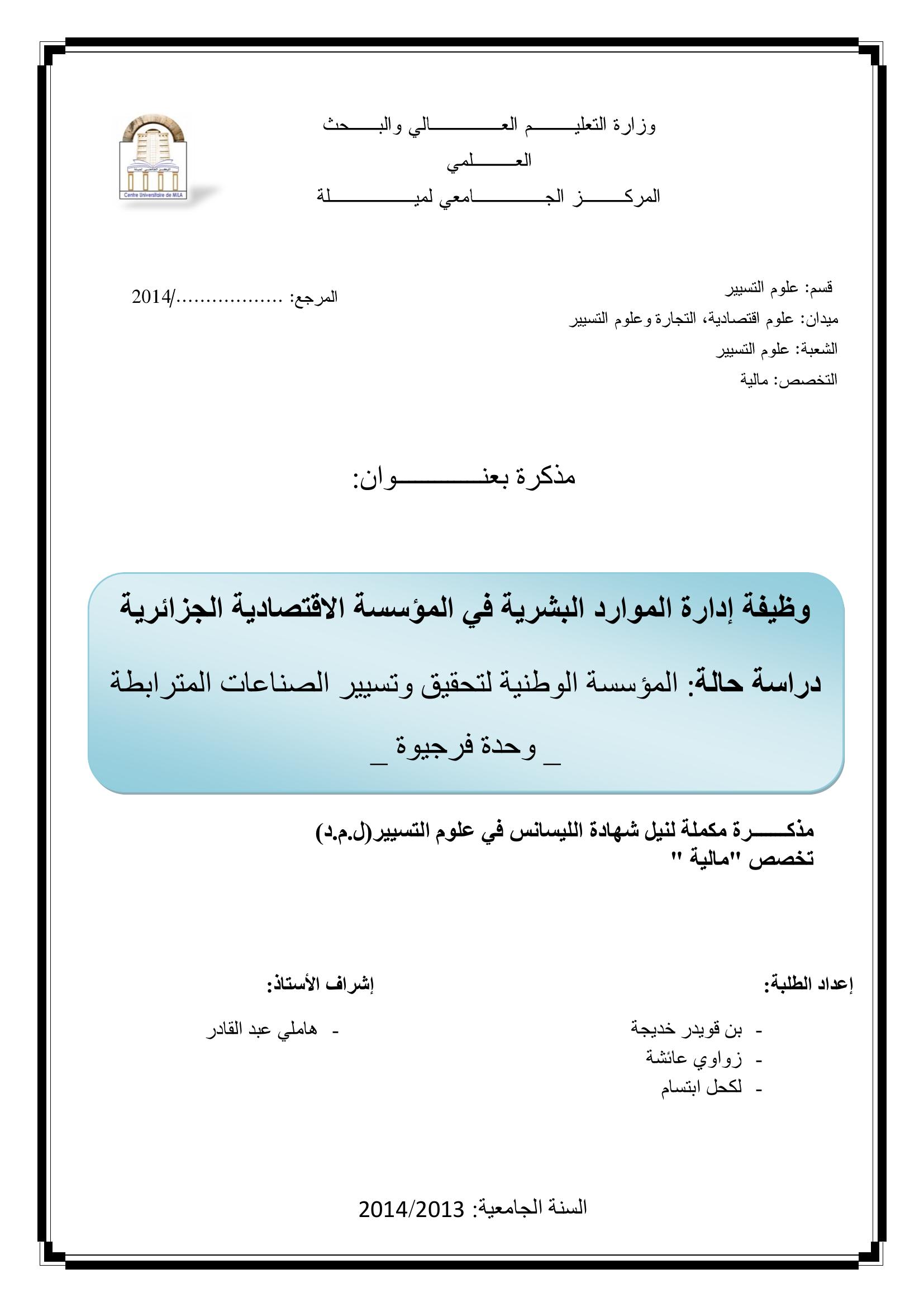 بن قويدر خديجة & هاملي عبد القادر(مشرفا) (2014). وظيفة إدارة الموارد البشرية في المؤسسة الاقتصادية الجزائرية دراسة حالة المؤسسة الوطنية لتحقيق وتسيير الصناعات المترابطة -وحدة فرجيوة-.