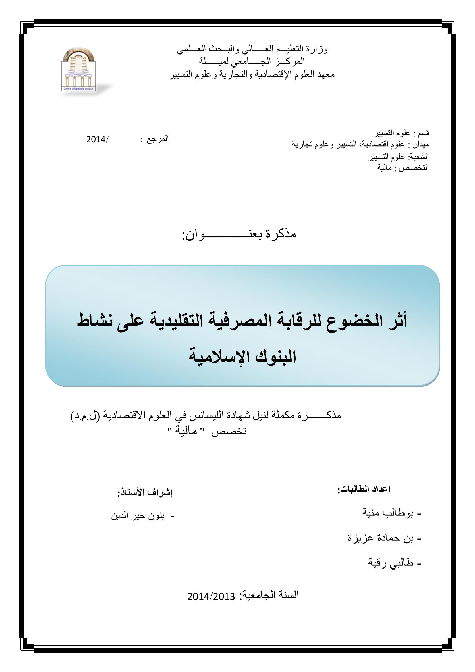 بوطالب منية & بنون خير الدين(مشرفا) (2014). أثر الخضوع للرقابة المصرفية التقليدية على نشاط البنوك الاسلامية.