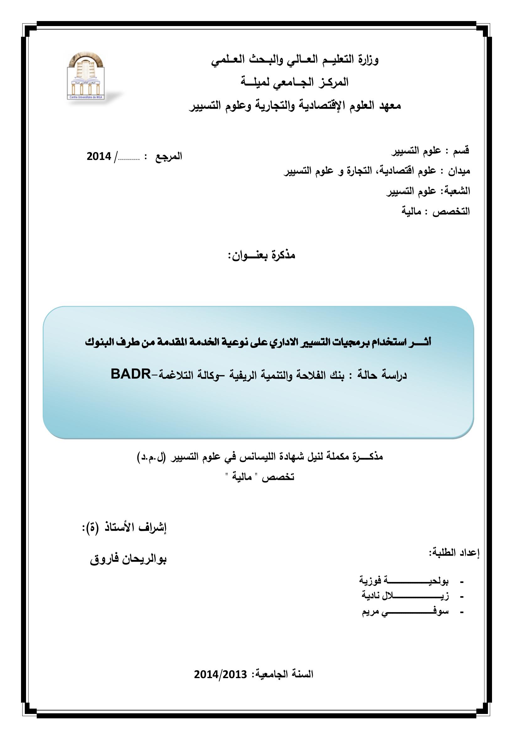 بولحية فوزية & بوالريحان فاروق (مشرفا) (2014). أثر استخدام برمجيات التسيير الاداري على نوعية الخدمة المقدمة من طرف البنوك دراسة حالة بنك الفلاحة والتنمية الريفية وكالة التلاغمة.