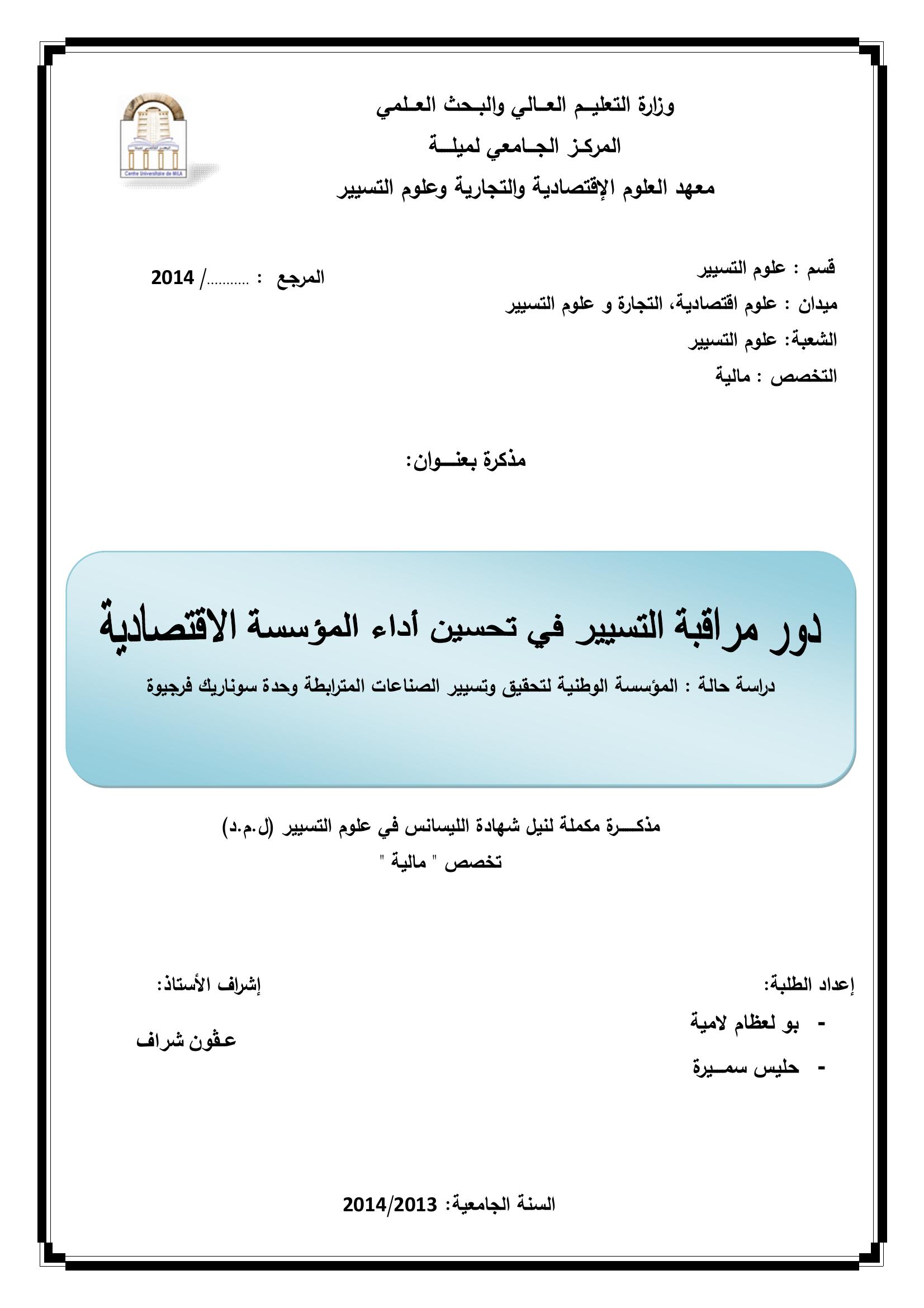 دور مراقبة التسيير في تحسين أداء المؤسسة الاقتصادية دراسة حالة المؤسسة الوطنية لتحقيق وتسيير الصناعات المترابطة وحدة سوناريك فرجيوة