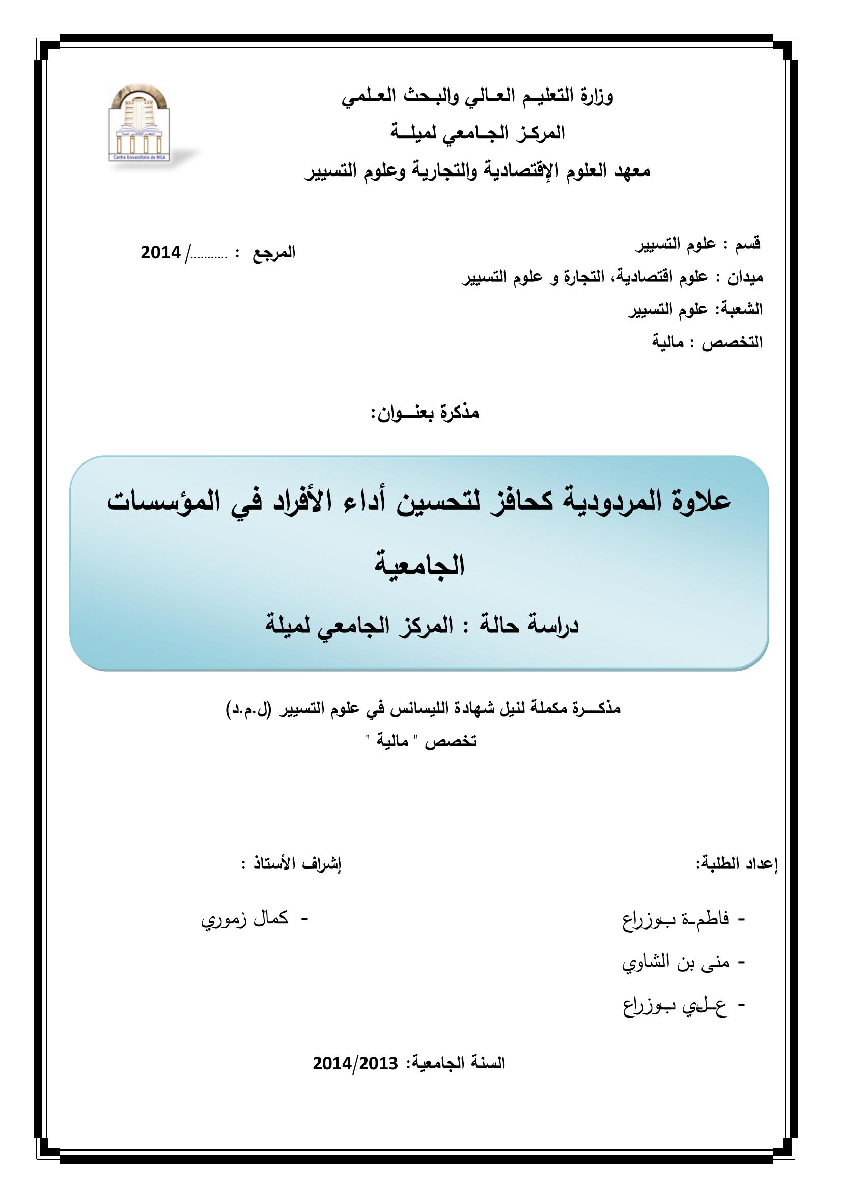 بوزراع فاطمة & زموري كمال (مشرفا) (2014). علاوة المردودية كحافز لتحسين أداء الأفراد في المؤسسات الجامعية دراسة حالة المركز الجامعي لميلة.