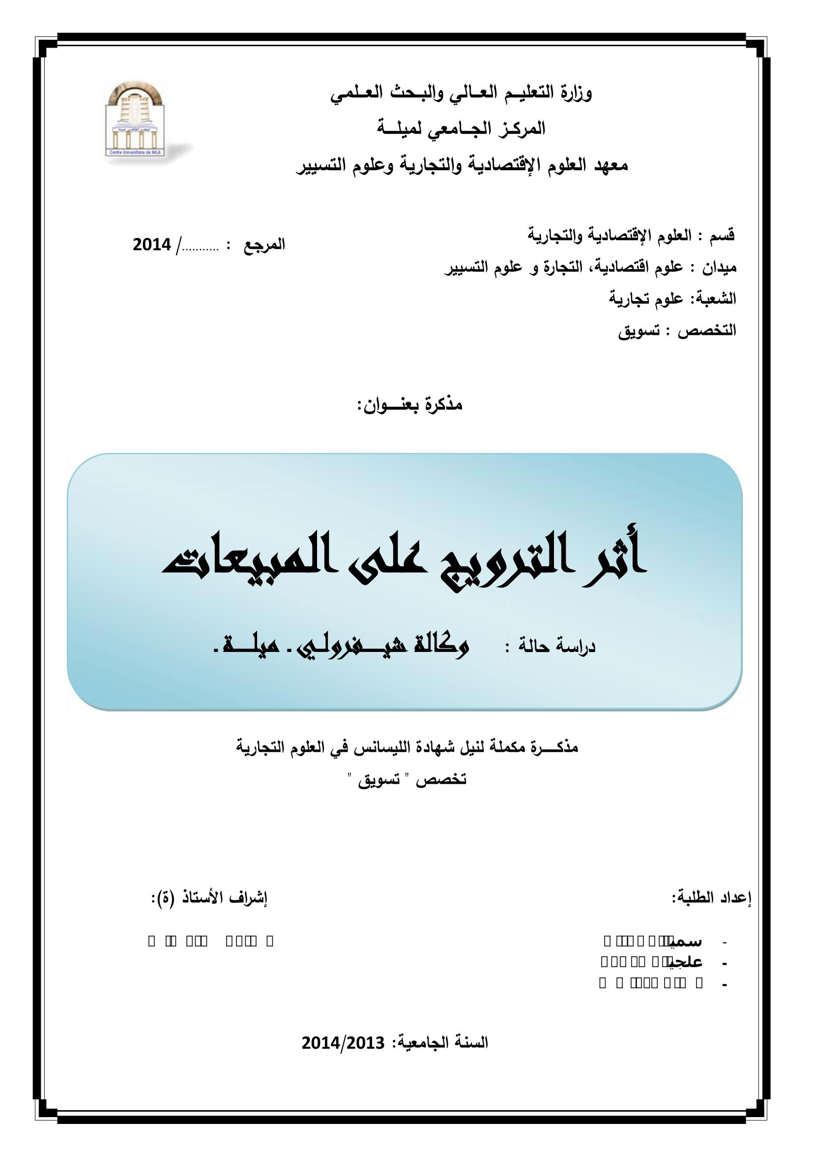 زعباط سميحة & أسامة سنوسي(مشرفا) (2014). أثر الترويج على المبيعات دراسة حالة وكالة شيفرولي - ميلة -.