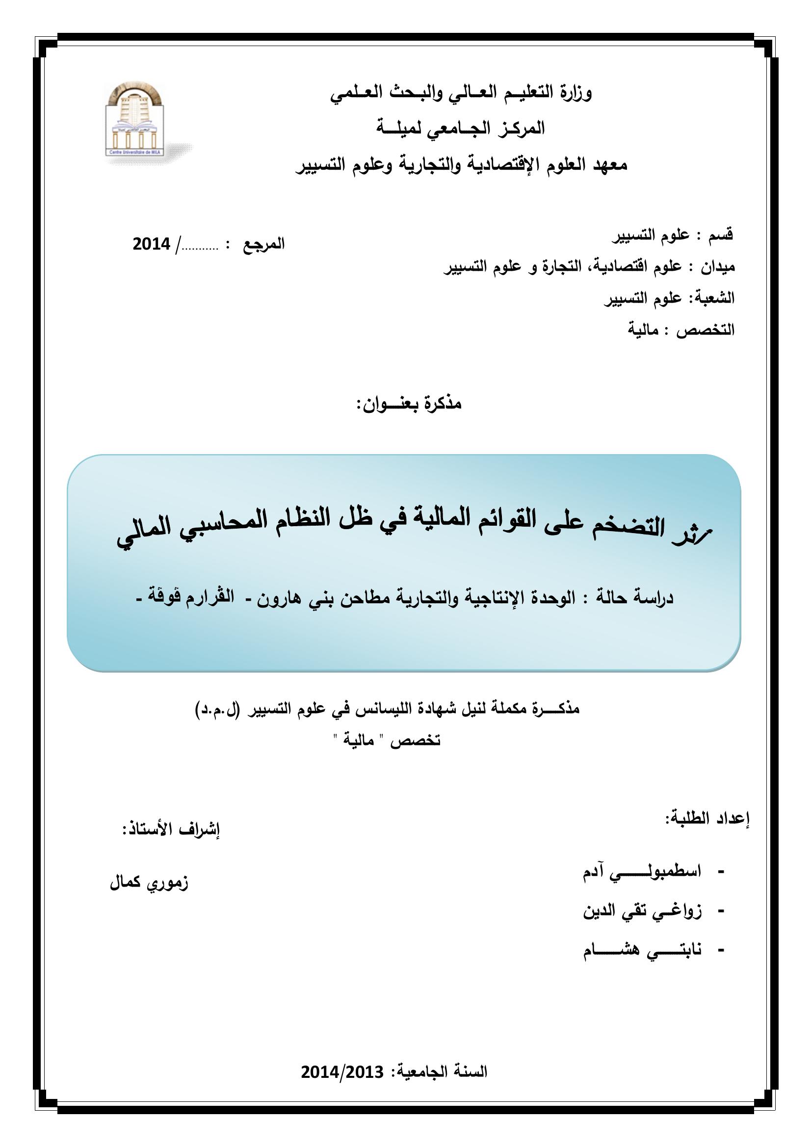 زواغي تقي الدين & زموري كمال (مشرفا) (2014). أثر التضخم على القوائم المالية في ظل النطام المحاسبي المالي دراسة حالة الوحدة الإنتاجية والتجارية مطاحن بني هارون -القرارم قوقة-.