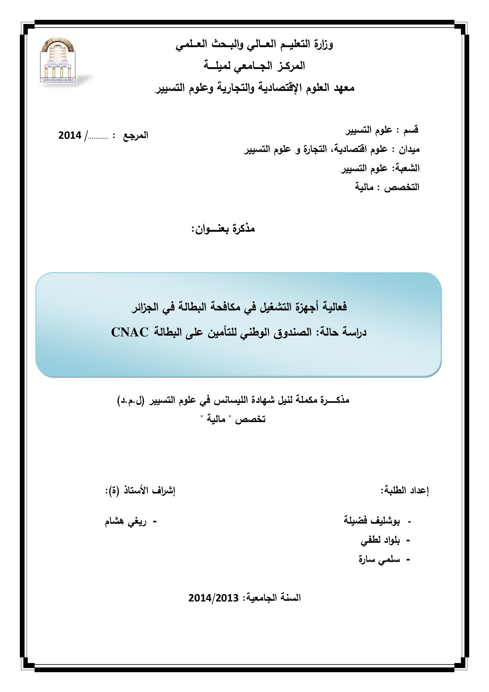 بوشليف فضيلة & ريغي هشام (مشرفا) (2014). فعالية أجهزة التشغيل في مكافحة البطالة في الجزائر دراسة حالة الصندوق الوطني للتأمين على البطالة CNAC.