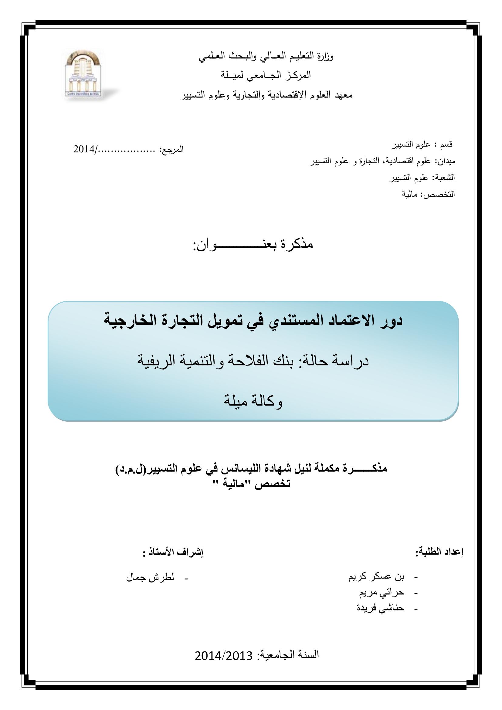 بن عسكر كريم & لطرش جمال(مشرفا) (2014). دور الاعتماد المستندي في تمويل التجارة الخارجية دراسة حالة بنك الفلاحة والتنمية الريفية وكالة ميلة.