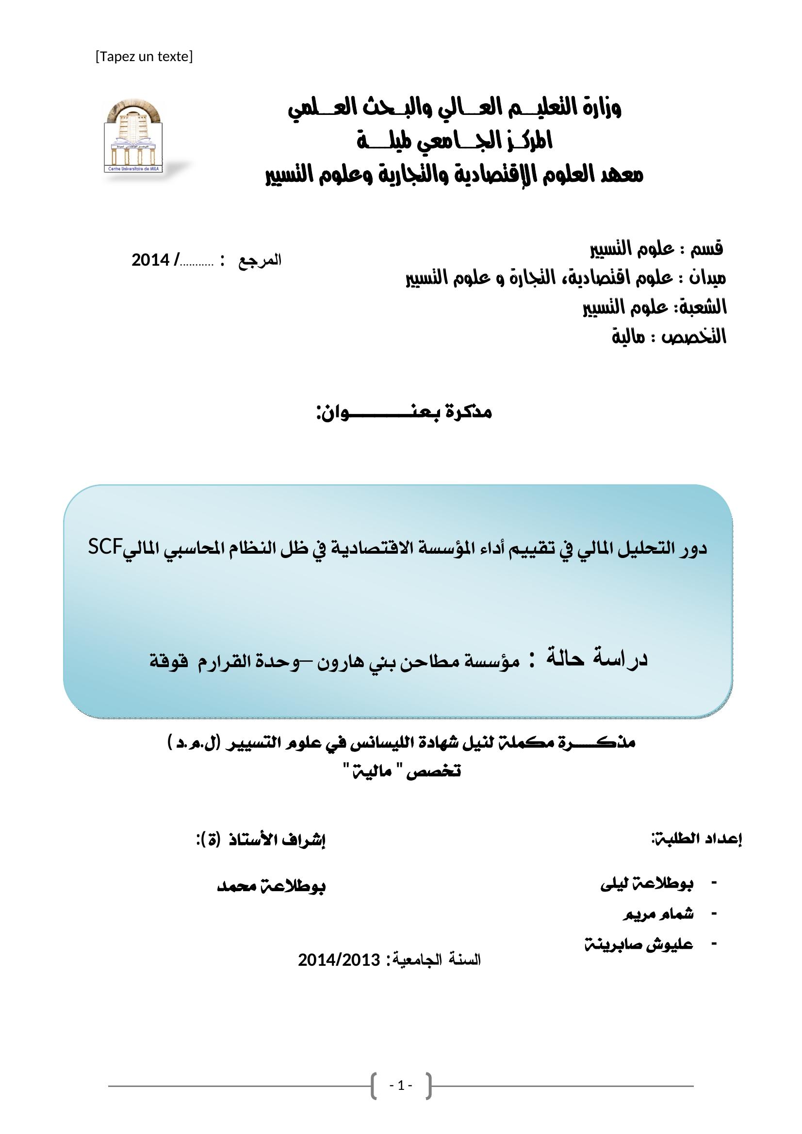 دور التحليل المالي في تقييم أداء المؤسسة الاقتصادية في ظل النظام المحاسبي المالي SCF دراسة حالة مؤسسة مطاحن بني هارون -وحدة القرارم قوقة-