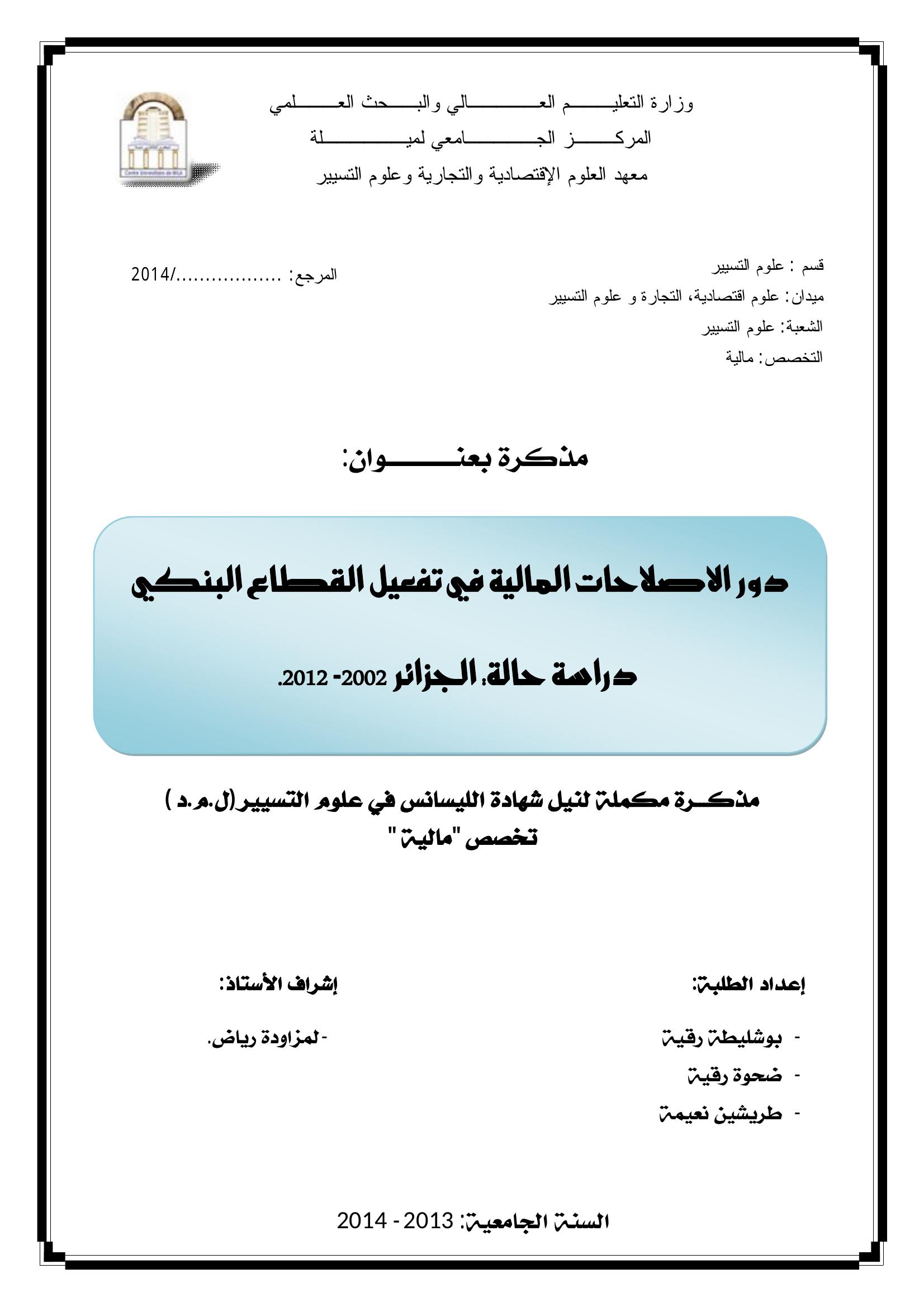 بوشليطة رقية & لمزاودة رياض (مشرفا) (2014). دور الصلاحات المالية في تفعيل القطاع البنكي دراسة حالة الجزائر 2002 -2012.