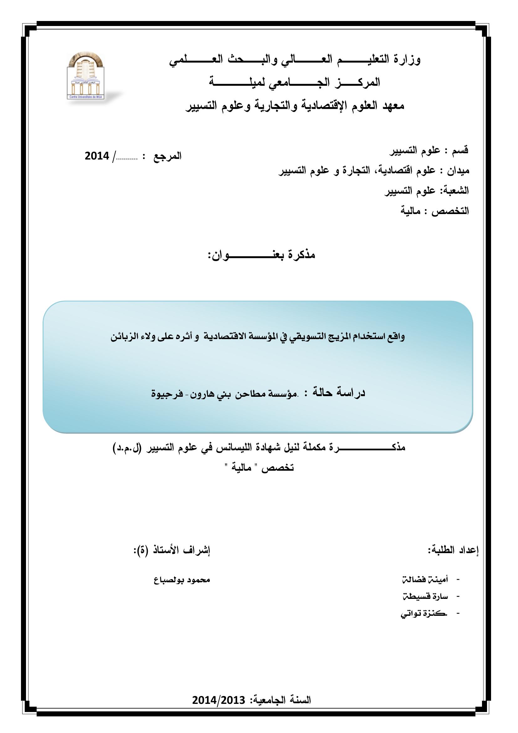فضالة أمينة & بولصباع محمود (مشرفا) (2014). واقع استخدام المزيج التسويقي في المؤسسة الاقتصادية وأثره على ولاء الزبائن دراسة حالة مؤسسة مطاحن بني هارون -فرجيوة-.
