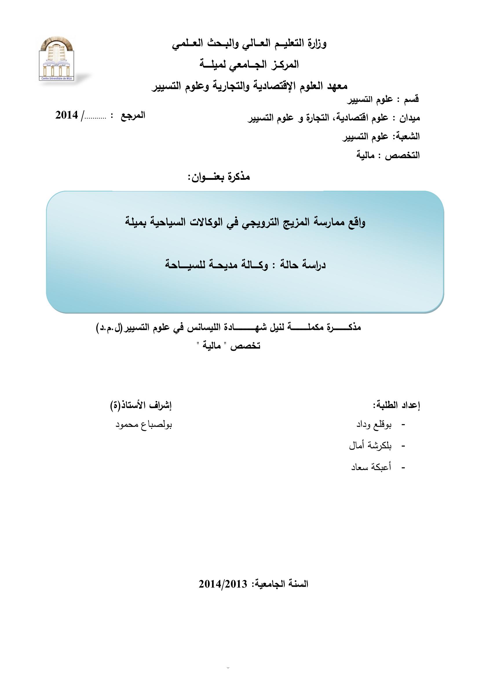 بلكرشة أمال & بولصباع محمود (مشرفا) (2014). واقع ممارسة المزيج الترويجي في الوكالات السياحية بميلة دراسة حالة وكالة مديحة للسياحة.