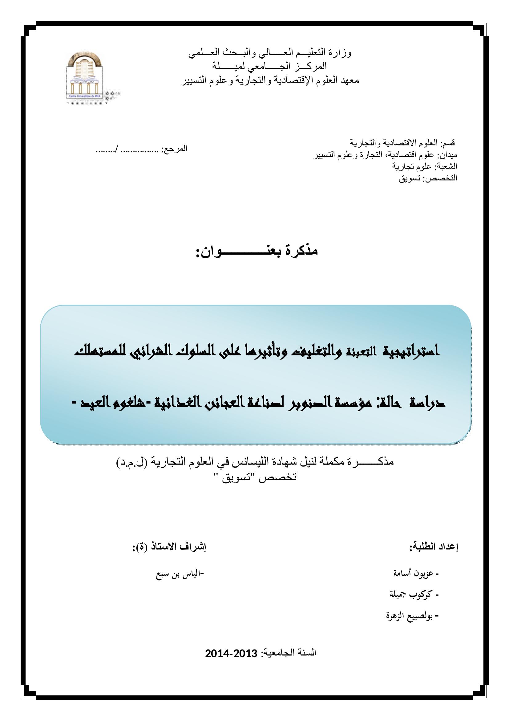 بوصبيع الزهرة & بن سبع إلياس(مشرفا) (2014). استراتيجية التعبئة والتغليف وتأثيرها على السلوك الشرائي للمستهلك دراسة حالة مؤسسة الصنوبر لصناعة العجائن الغدائية - شلغوم العيد -.
