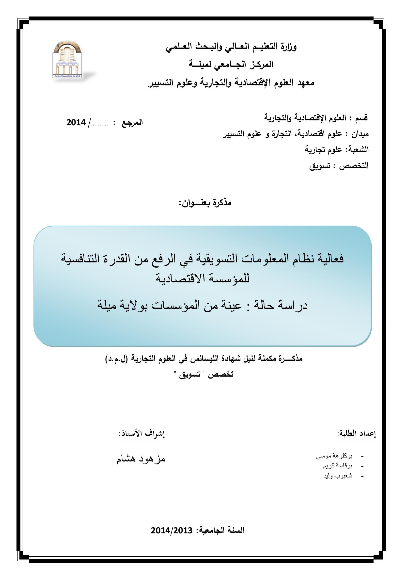بوكلوهة موسى & مزهود هشام(مشرفا) (2014). فعالية نظام المعلومات التسويقية في الرفع من القدرة التنافسية للمؤسسة الإقتصادية دراسة حالة عينة من المؤسسات بولاية ميلة.