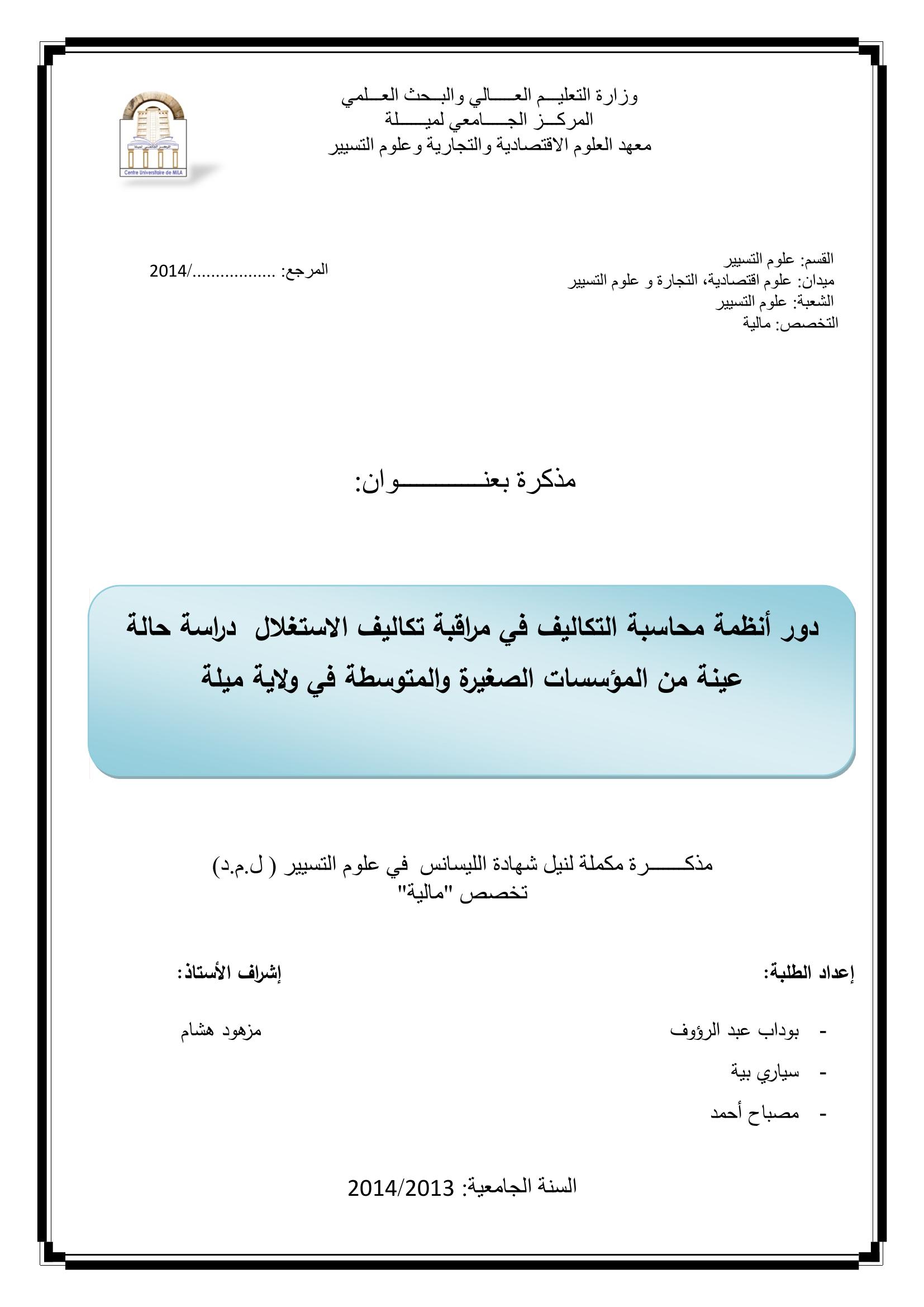 بوداب عبد الرؤوف & مزهود هشام(مشرفا) (2014). دور أنظمة محاسبة التكاليف في مراقبة تكاليف الاستغلال دراسة حالة عينة من المؤسسات الصغيرة والمتوسطة في ولاية ميلة.