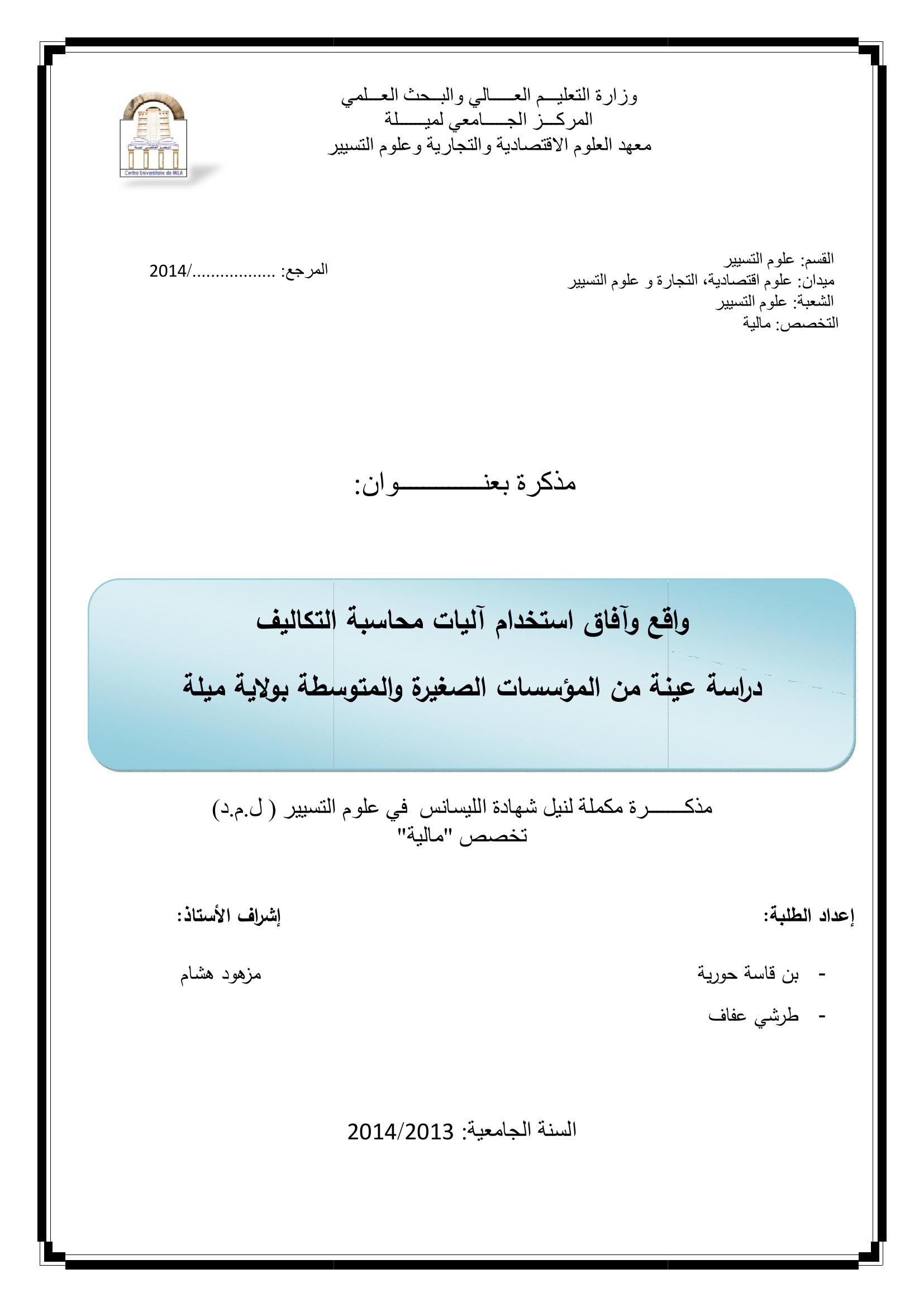 بن قاسة حورية & مزهود هشام(مشرفا) (2014). واقع وآفاق استخدام آليات محاسبة التكاليف دراسة عينة من المؤسسات الصغيرة والمتوسطة بولاية ميلة.