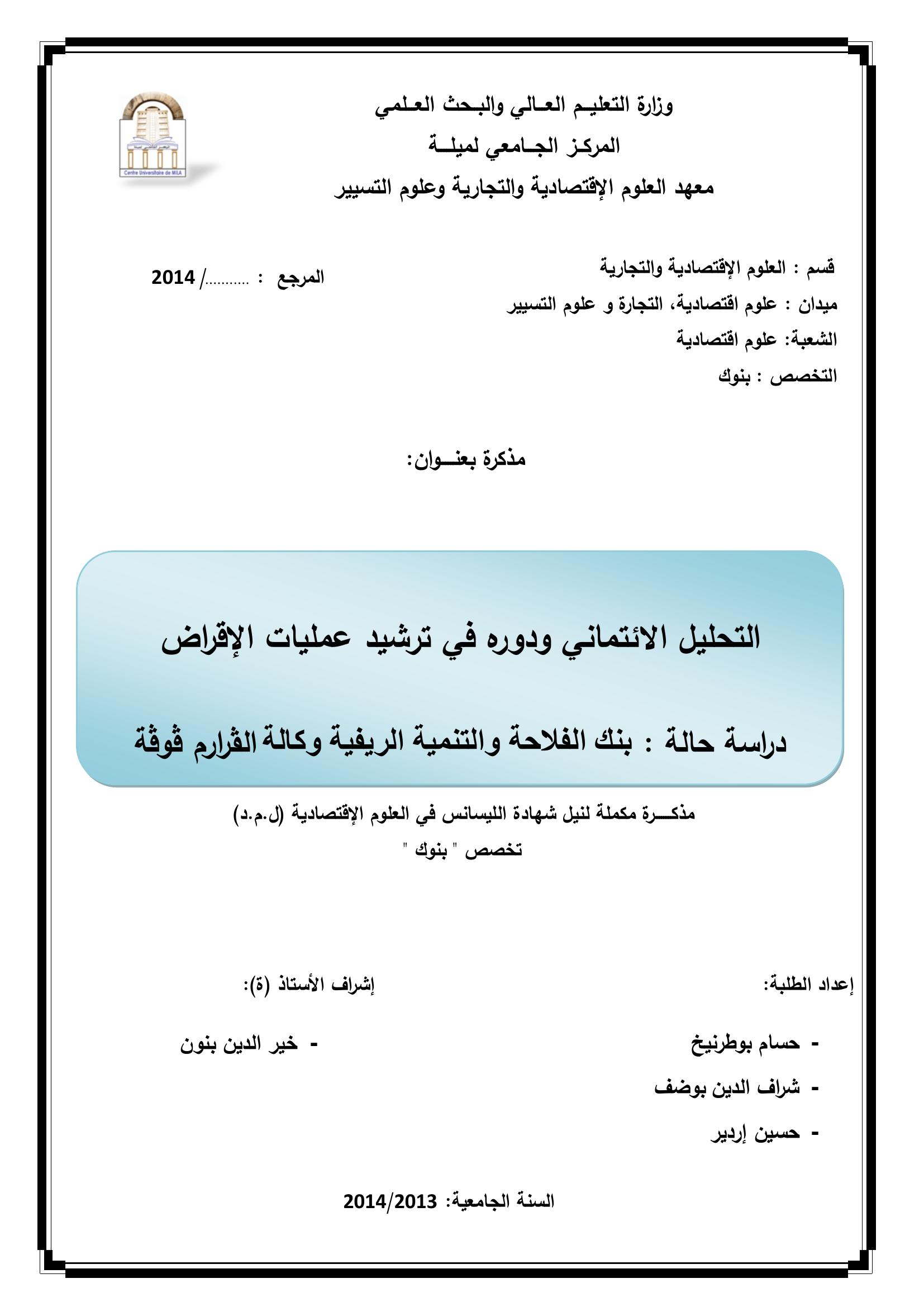 بوطرنبخ حسام & خير الدين بنون(مشرفا) (2014). التحليل الإنتمائي ودوره في ترشيد عمليات الإقراض،دراسة حالة:بنك الفلاحة والتنمية الريفية وكالة القرارم قوقة.