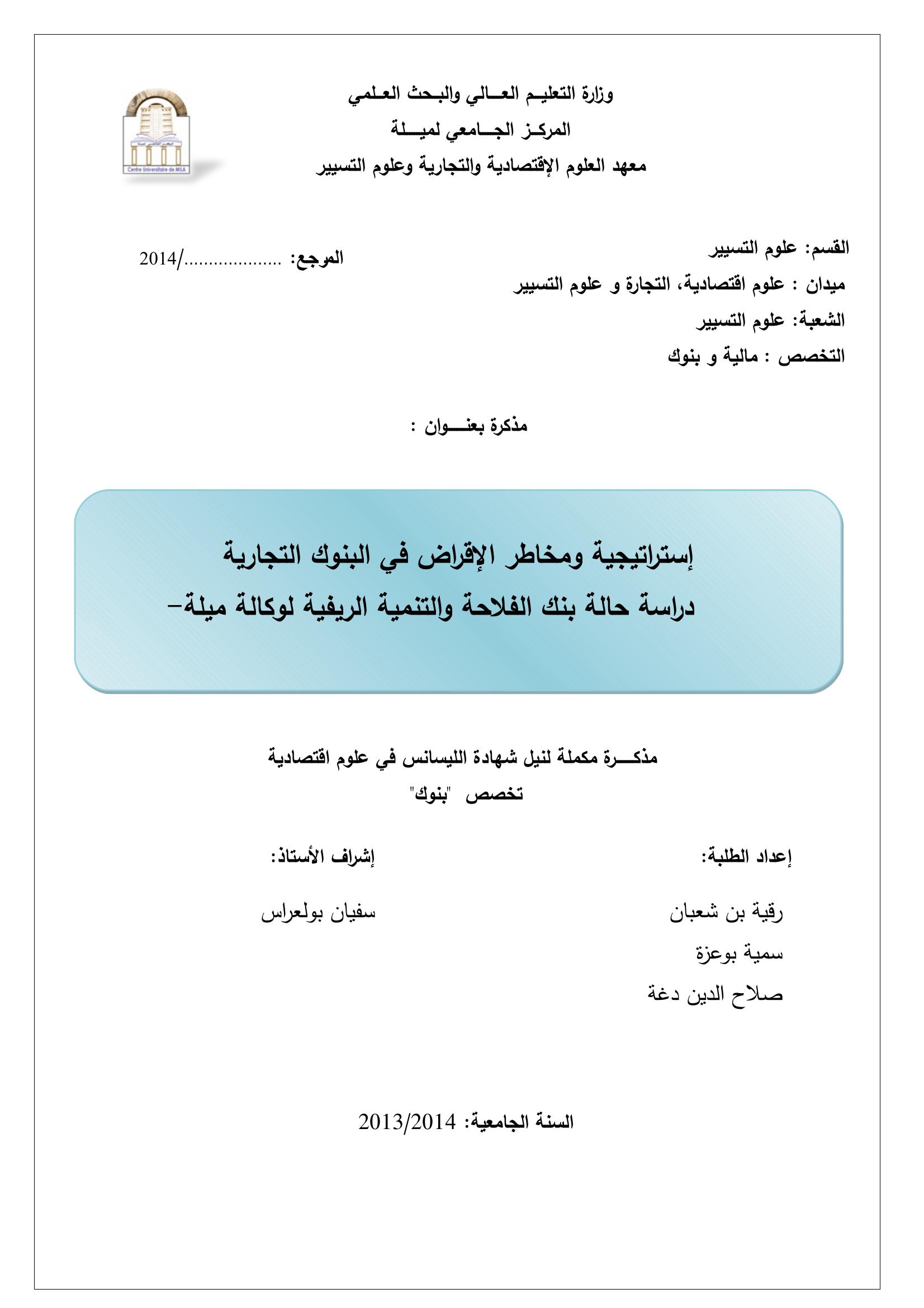 العيفة مريم & بولعراس سفيان(مشرفا) (2014). ضوابط منح الائتمان في البنوك التجارية دراسة حالة :البنك الوطني الجزائري - وكالة ميلة -.