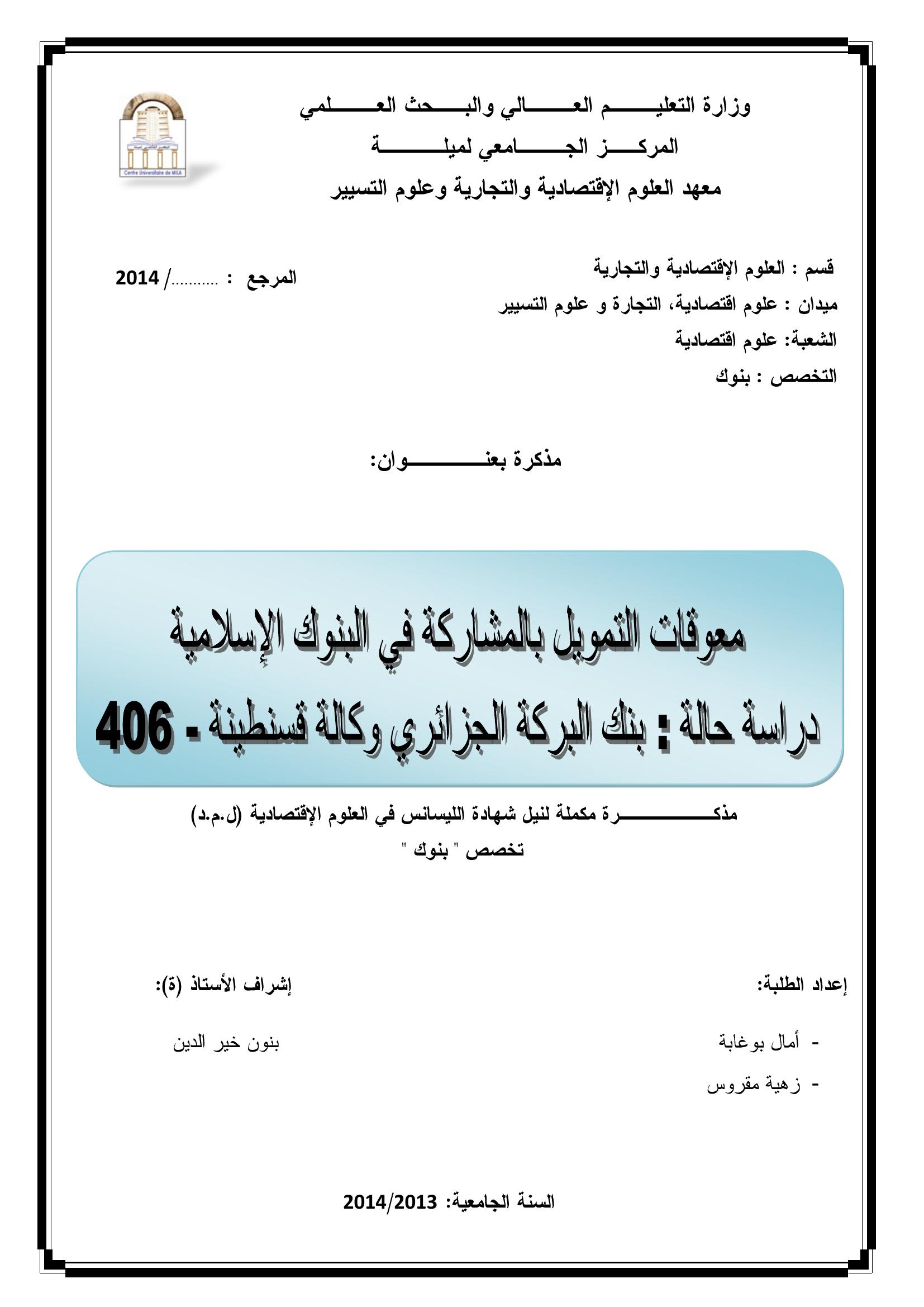 بوغابة أمال & خير الدين بنون(مشرفا) (2014). معوقات التمويل بالمشاركة في البنوك الإسلامية ، دراسة حالة: بنك البركة وكالة قسنطينة -406 -.