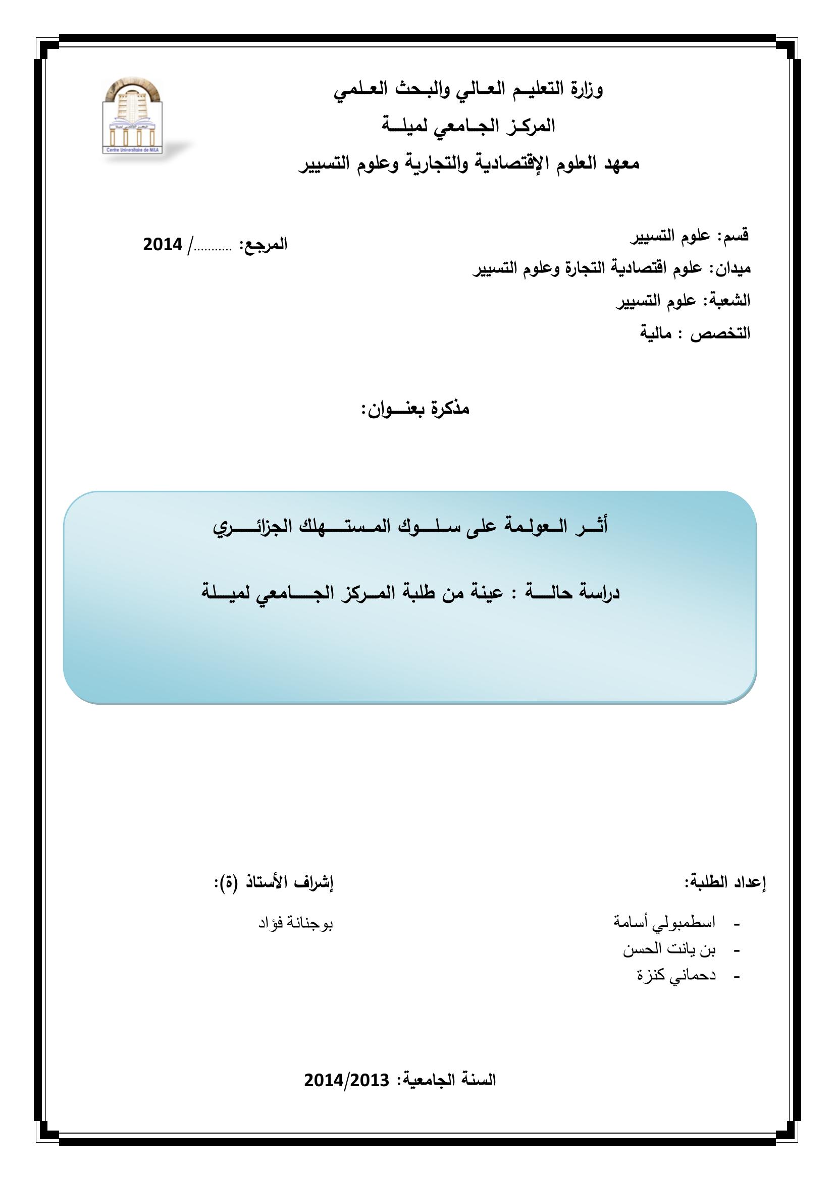 اسطمبولي أسامة & بوجنانة فؤاد (مشرفا) (2014). أثر العولمة على سلوك المستهلك الجزائري دراسة حالة عينة من طلبة المركز الجامعي لميلة.